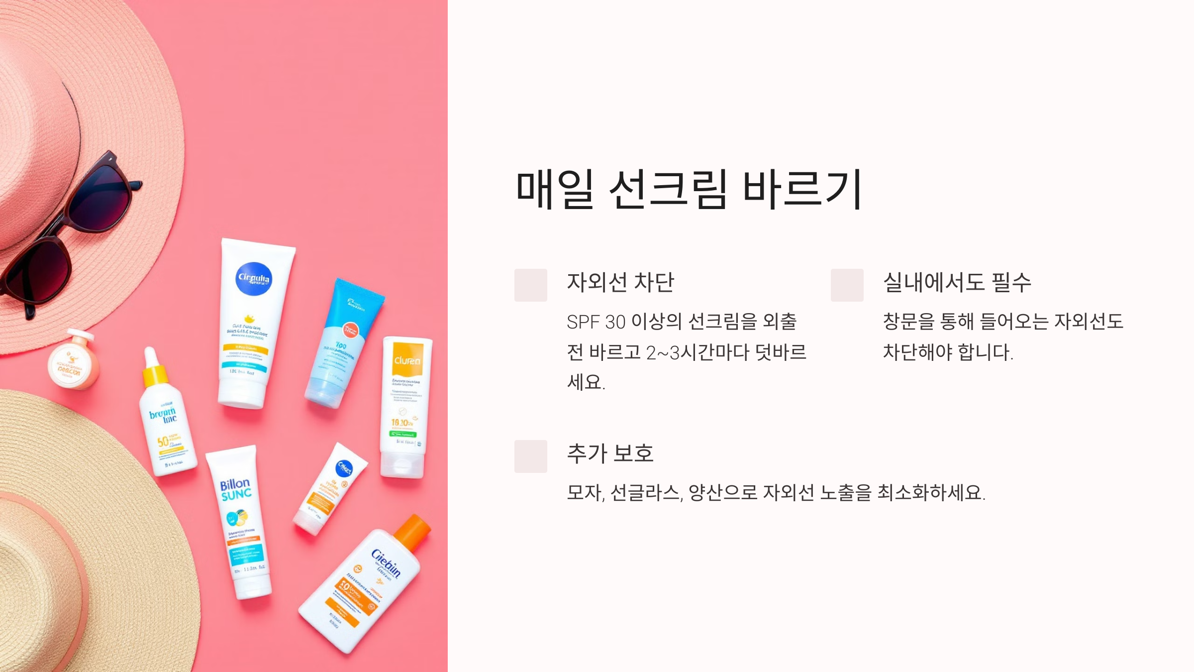 모자, 선글라스, 양산을 함께 사용해 자외선 노출을 최소화하세요.