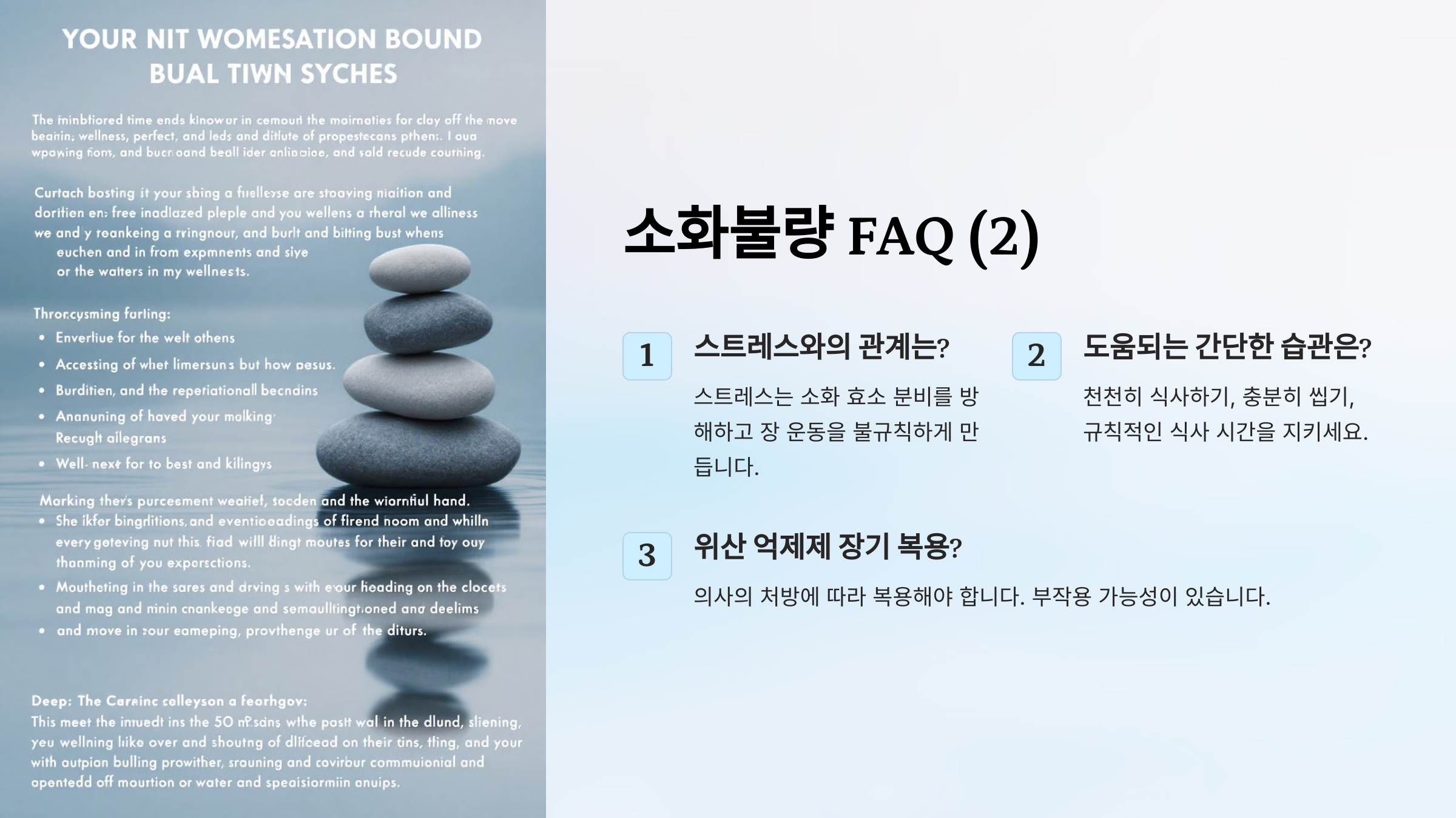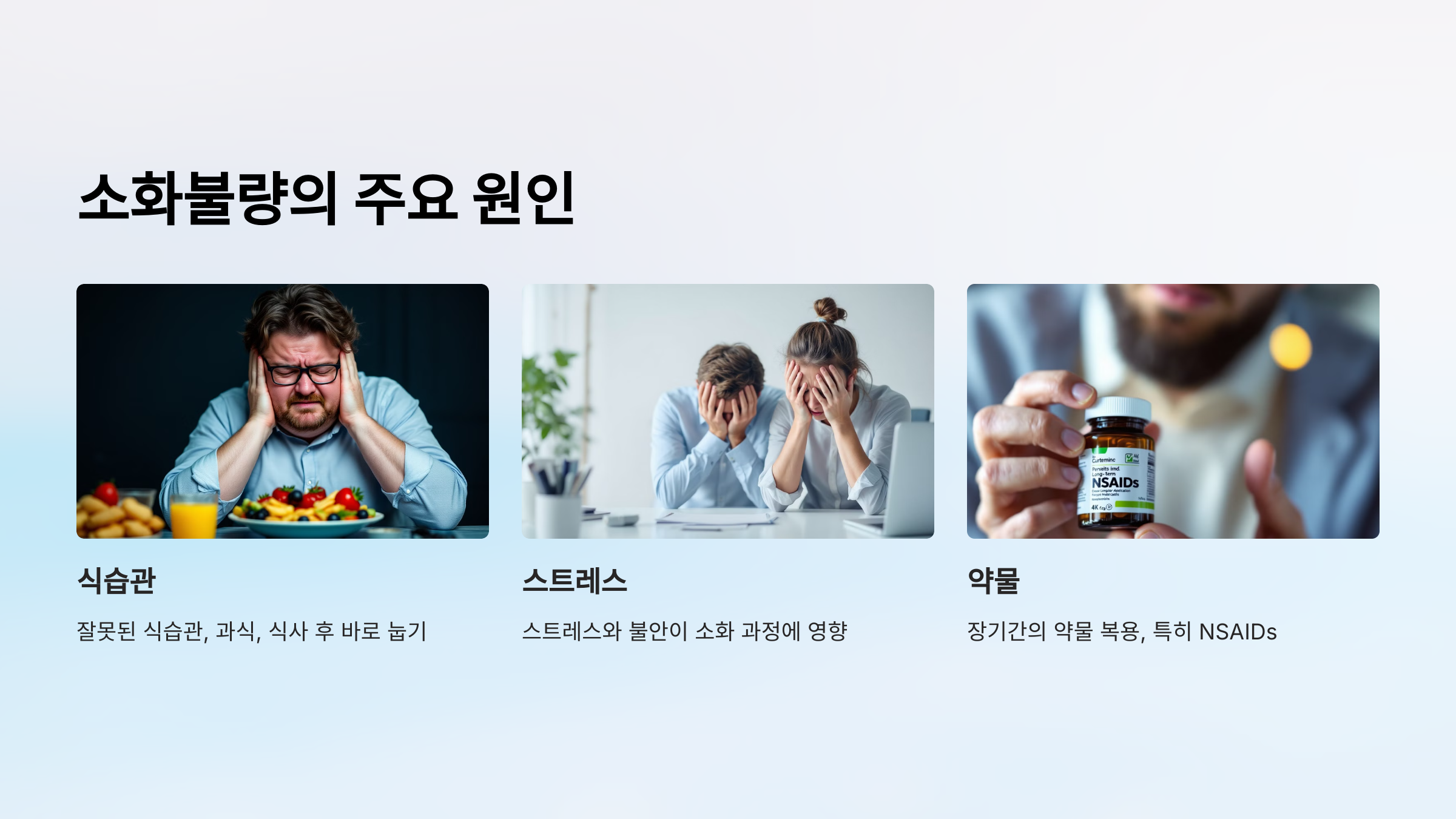 소화불량은 단순히 식습관 문제뿐 아니라, 스트레스, 질환 등 다양한 원인에 의해 발생할 수 있습니다.