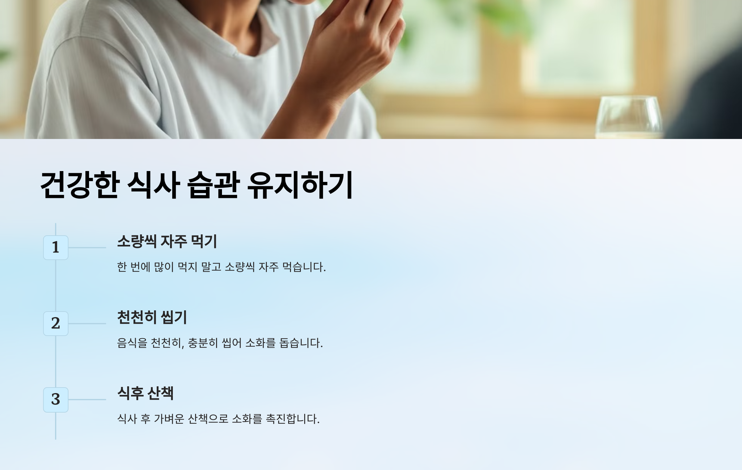 식사를 천천히 하고, 충분히 씹는 것도 소화를 원활하게 하는 데 중요합니다.