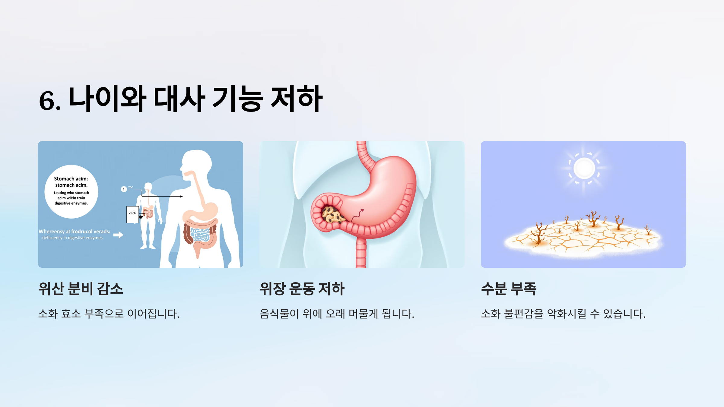 노화로 인한 위장 운동 저하는 음식물이 위에 오래 머물게 해 불편감을 초래합니다.