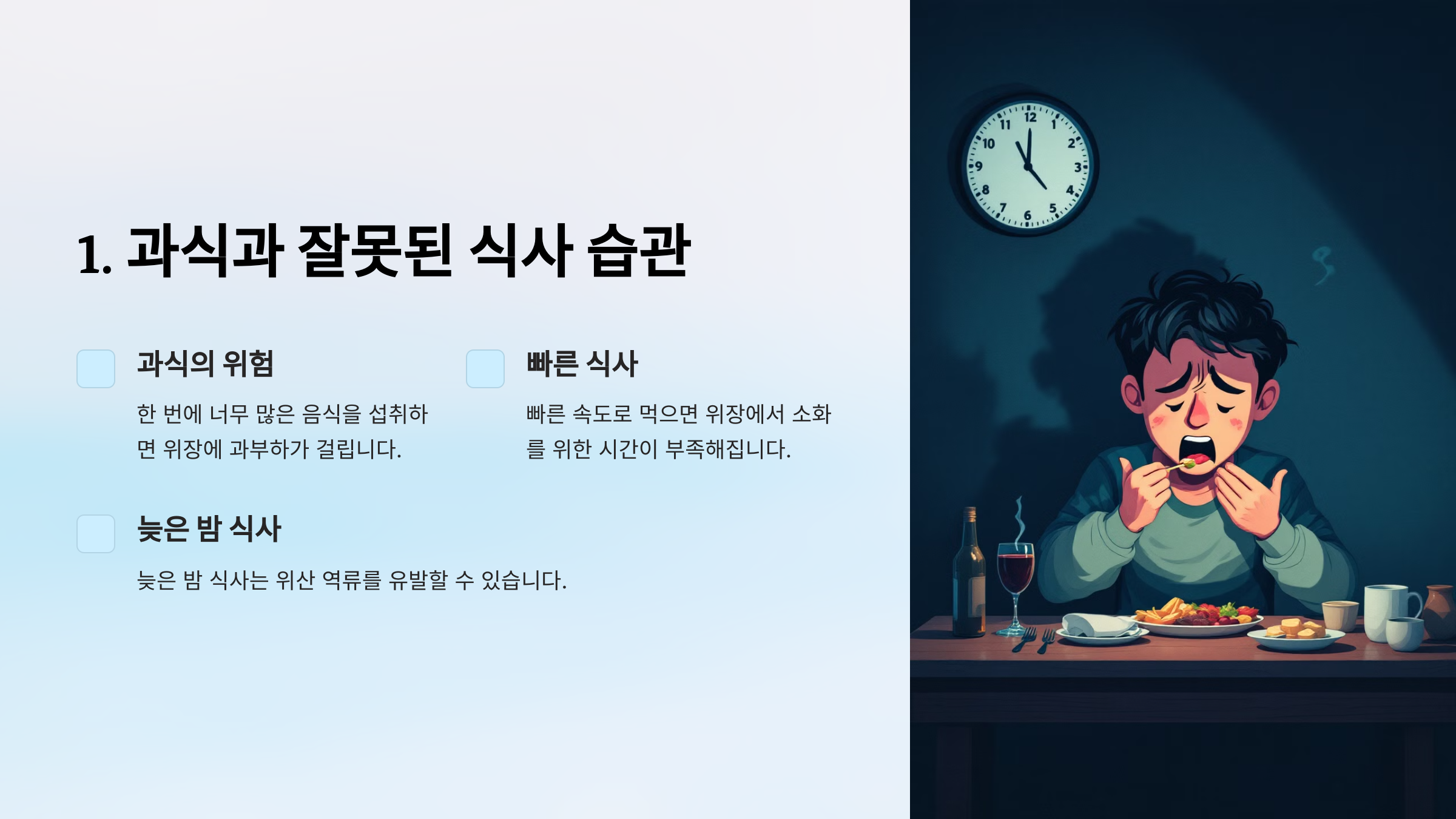 늦은 밤 식사는 위산 역류를 유발할 수 있으며, 이는 소화불량의 주요 증상이 될 수 있습니다.