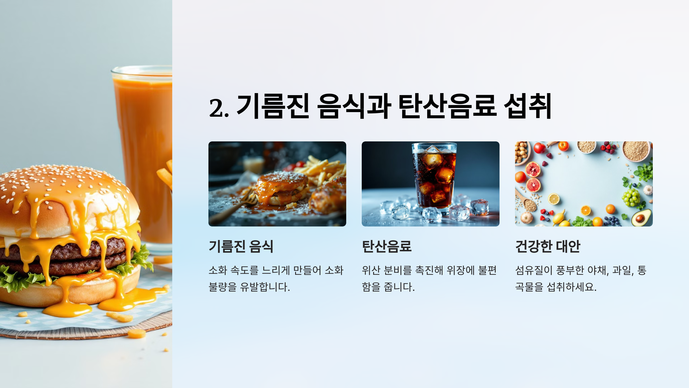탄산음료는 위산 분비를 촉진해 위장에 불편함을 주고, 트림과 위산 역류를 유발할 수 있습니다.