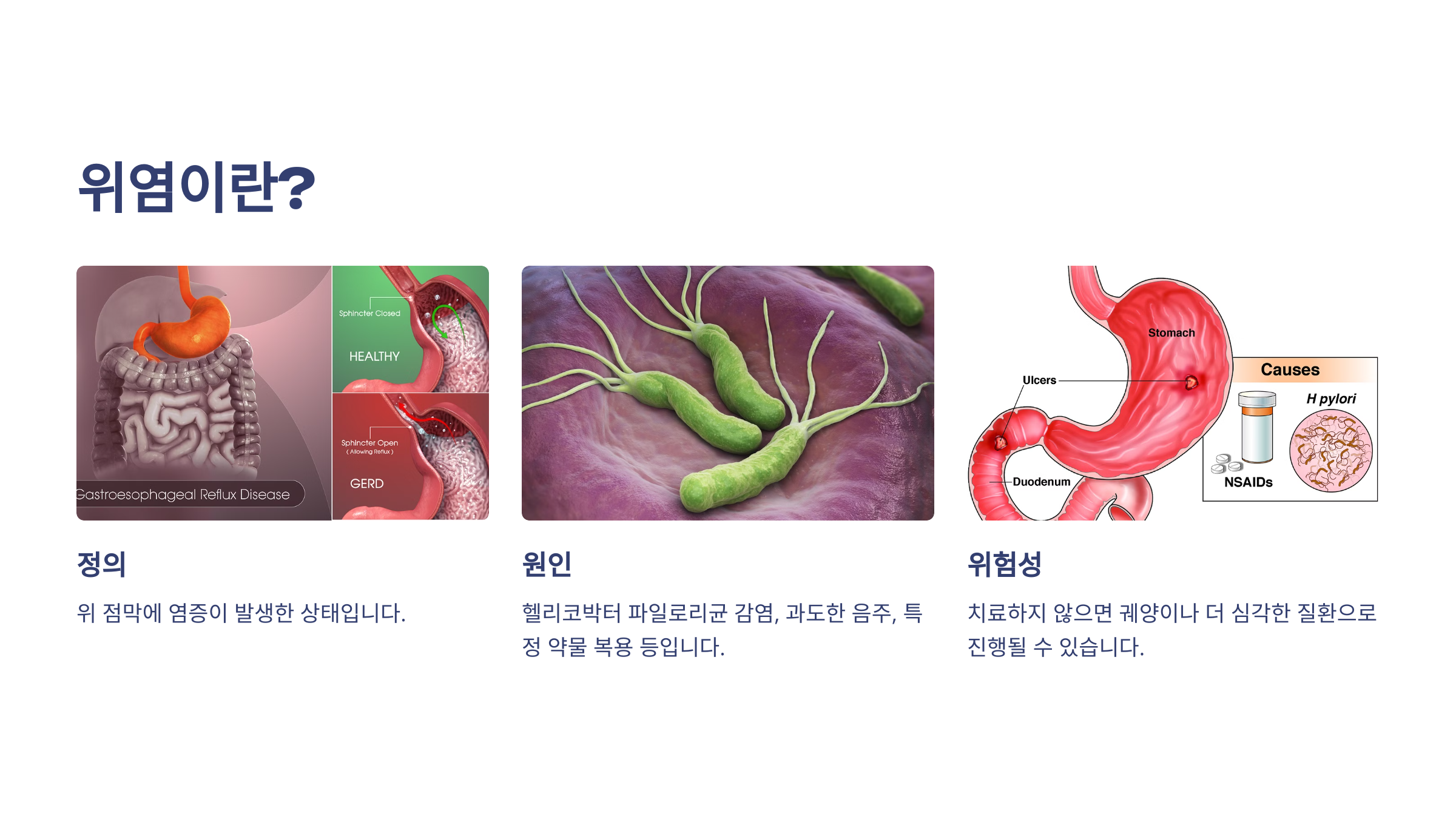 특히 위염은 초기에는 무증상인 경우도 많으므로 정기적인 검진이 필요합니다.