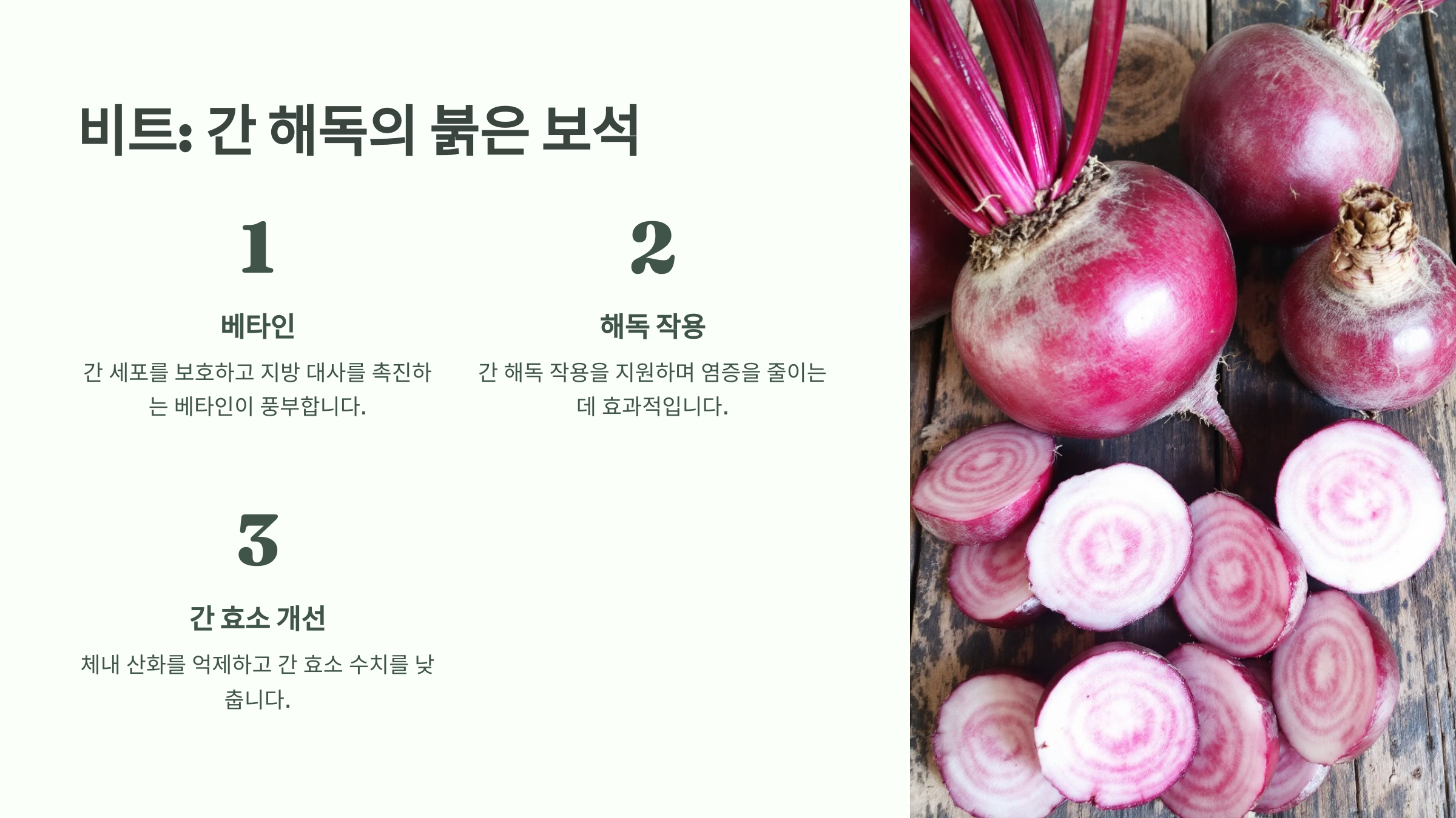 비트는 간 해독 작용을 지원하며 염증을 줄이는 데 효과적입니다.
