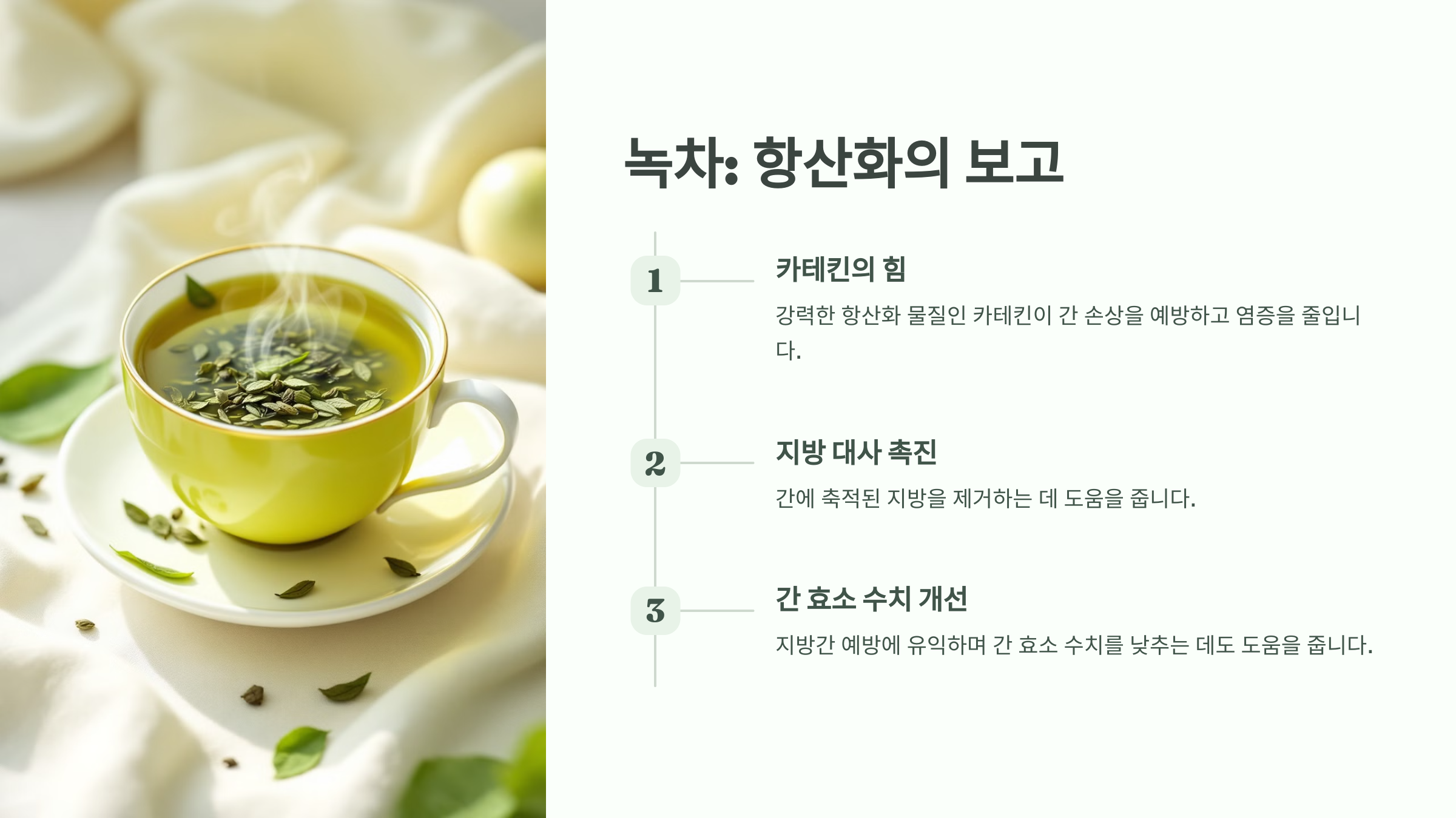 하루 2~3잔의 녹차를 꾸준히 섭취하면 간 건강에 도움이 됩니다.