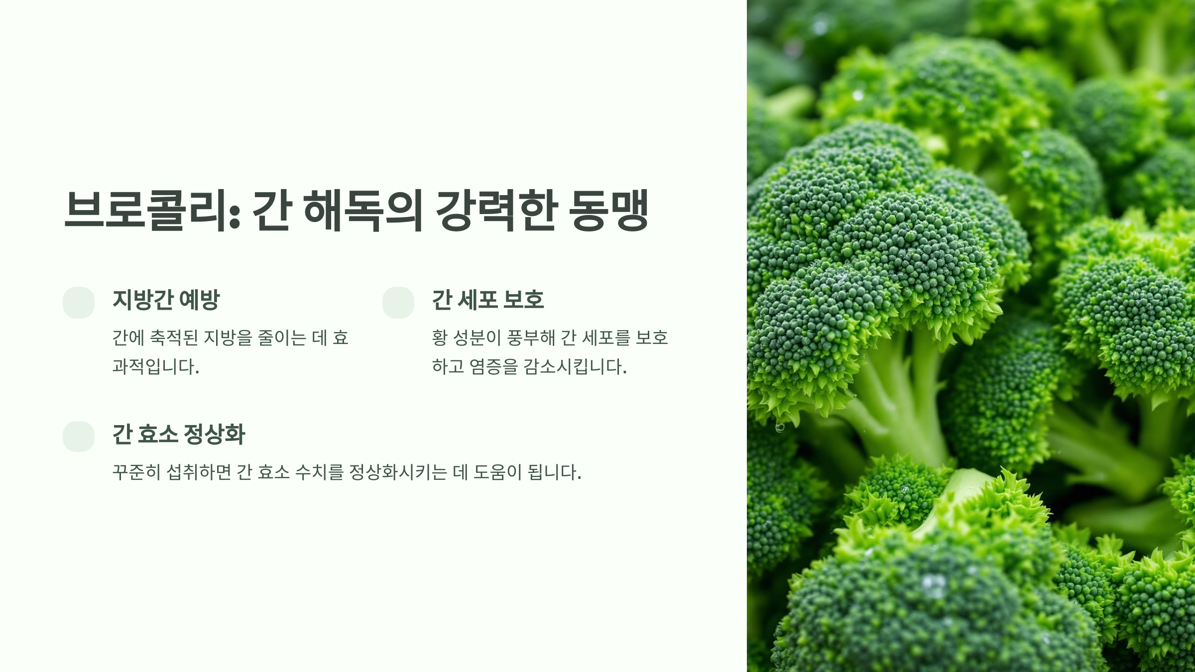브로콜리에는 황 성분이 풍부해 간 세포를 보호하고 염증을 감소시킵니다.