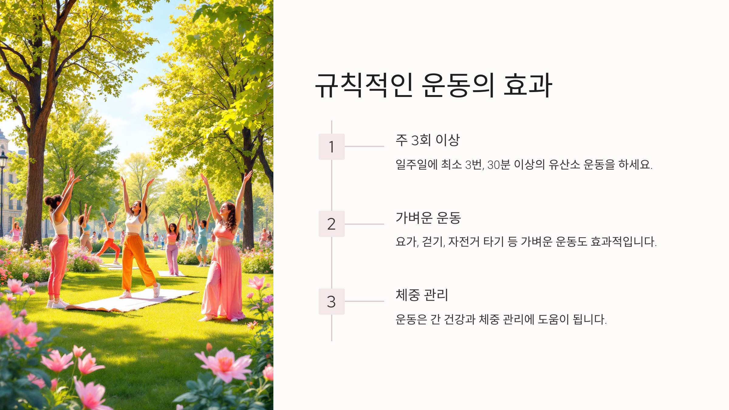 운동은 간 건강뿐만 아니라 체중 관리에도 도움을 줍니다.