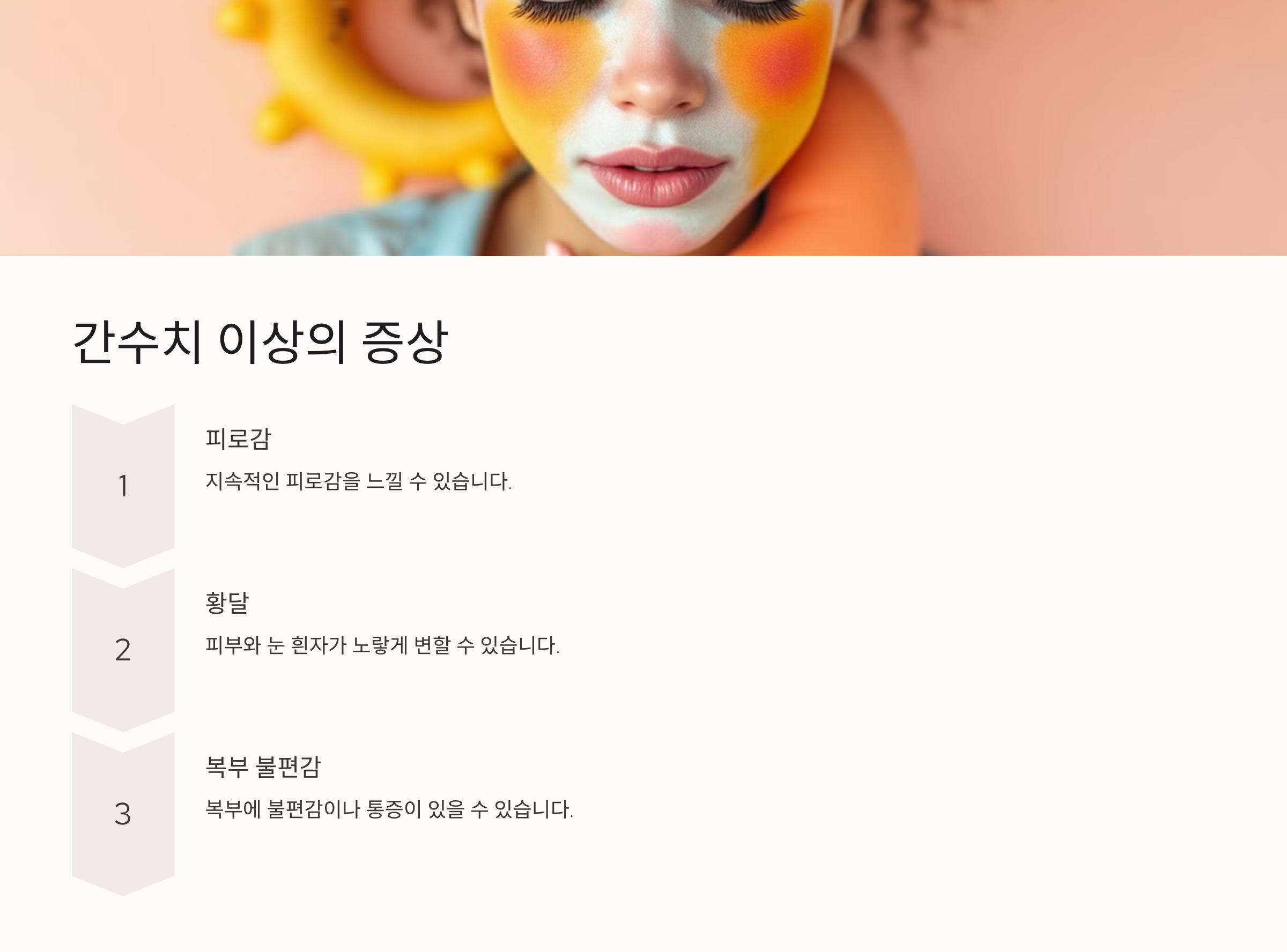 피로, 황달, 복부 불편감 등이 간수치 이상과 관련될 수 있습니다.