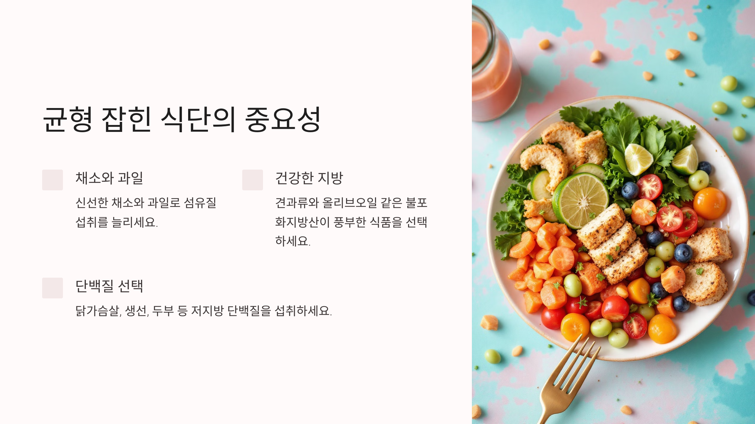 균형 잡힌 식단, 충분한 수분 섭취, 규칙적인 운동, 금주가 중요합니다.