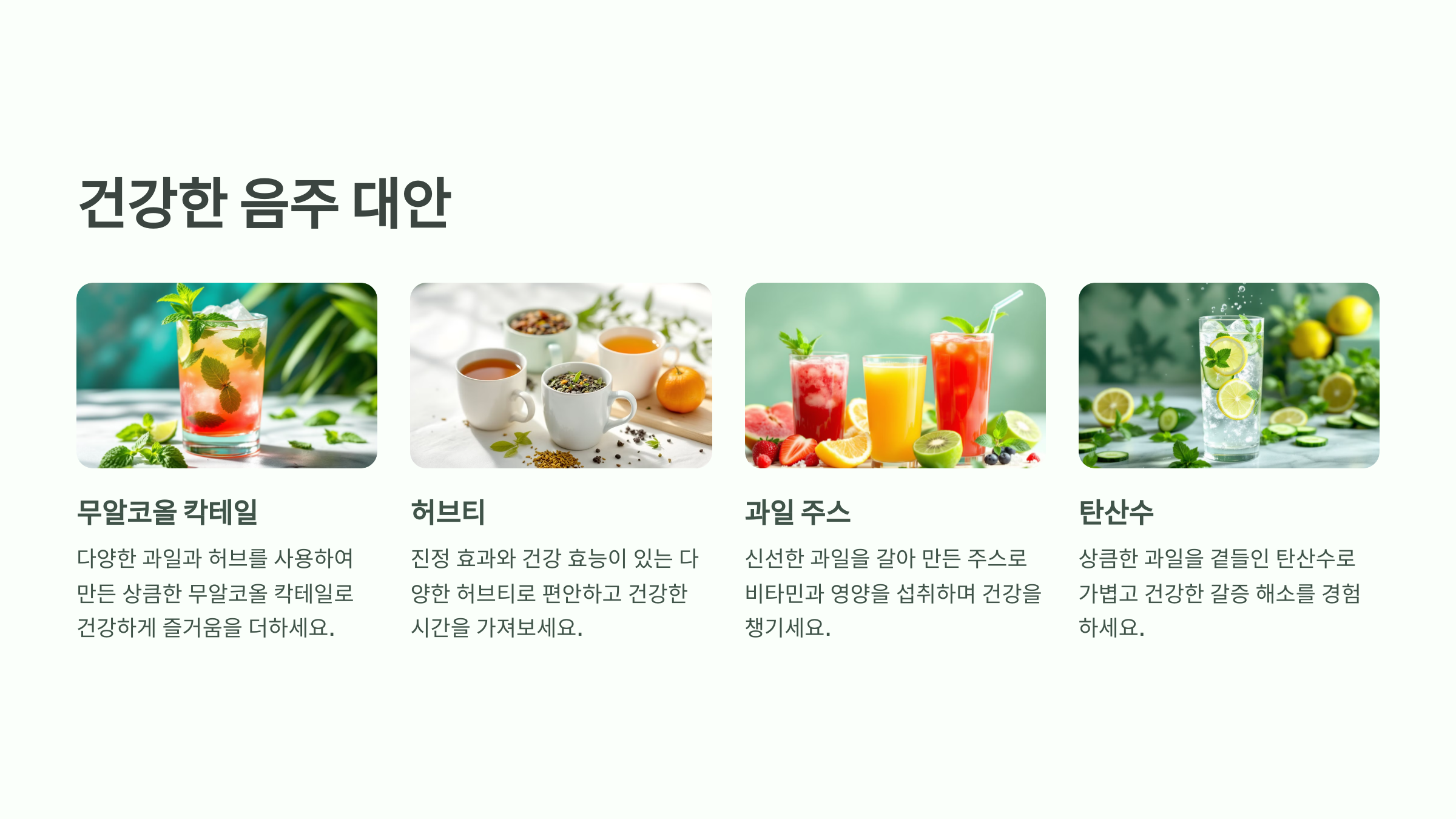 술 대신 즐길 수 있는 건강한 대안으로 무알코올 음료를 선택하세요.