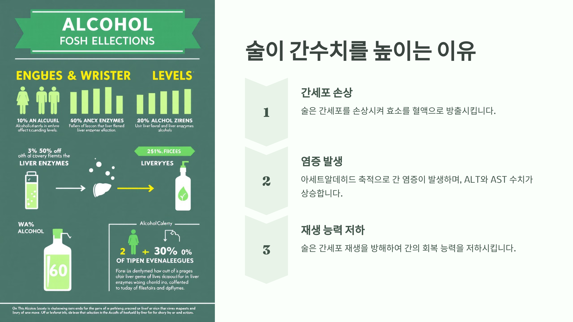 술은 간세포 손상을 유발하여 ALT와 AST 수치를 상승시킵니다.