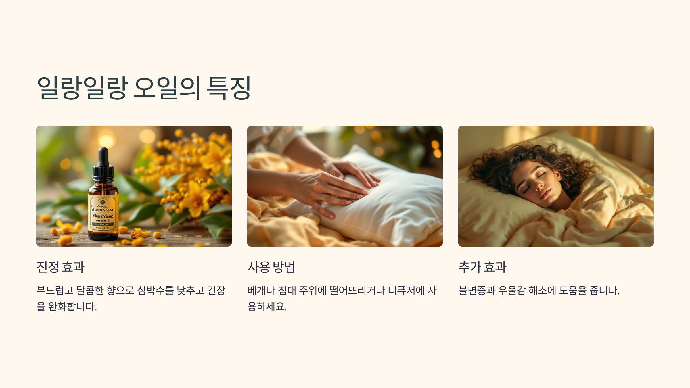 일랑일랑 오일은 부드럽고 달콤한 향으로 진정 효과를 제공합니다.