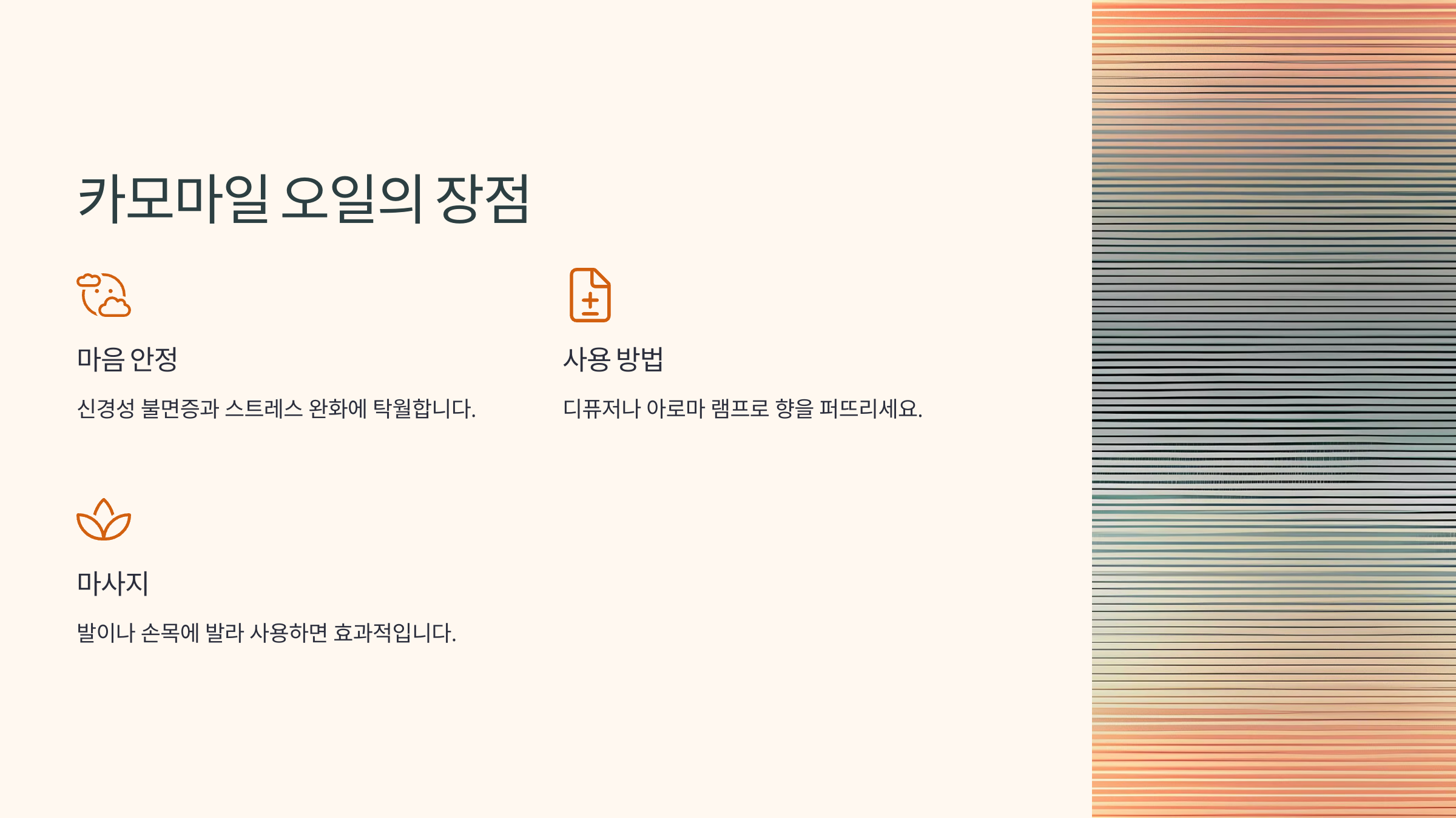 카모마일 오일은 마음을 안정시키고 편안한 상태로 만들어줍니다.