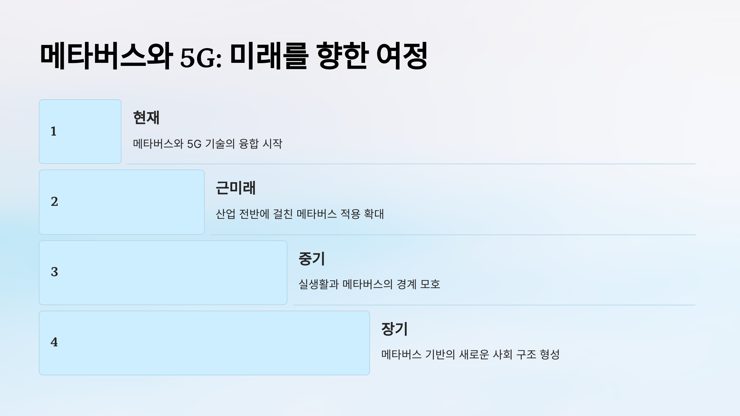 5G는 이러한 미래 기술들이 원활히 작동할 수 있는 네트워크 환경을 제공합니다.
