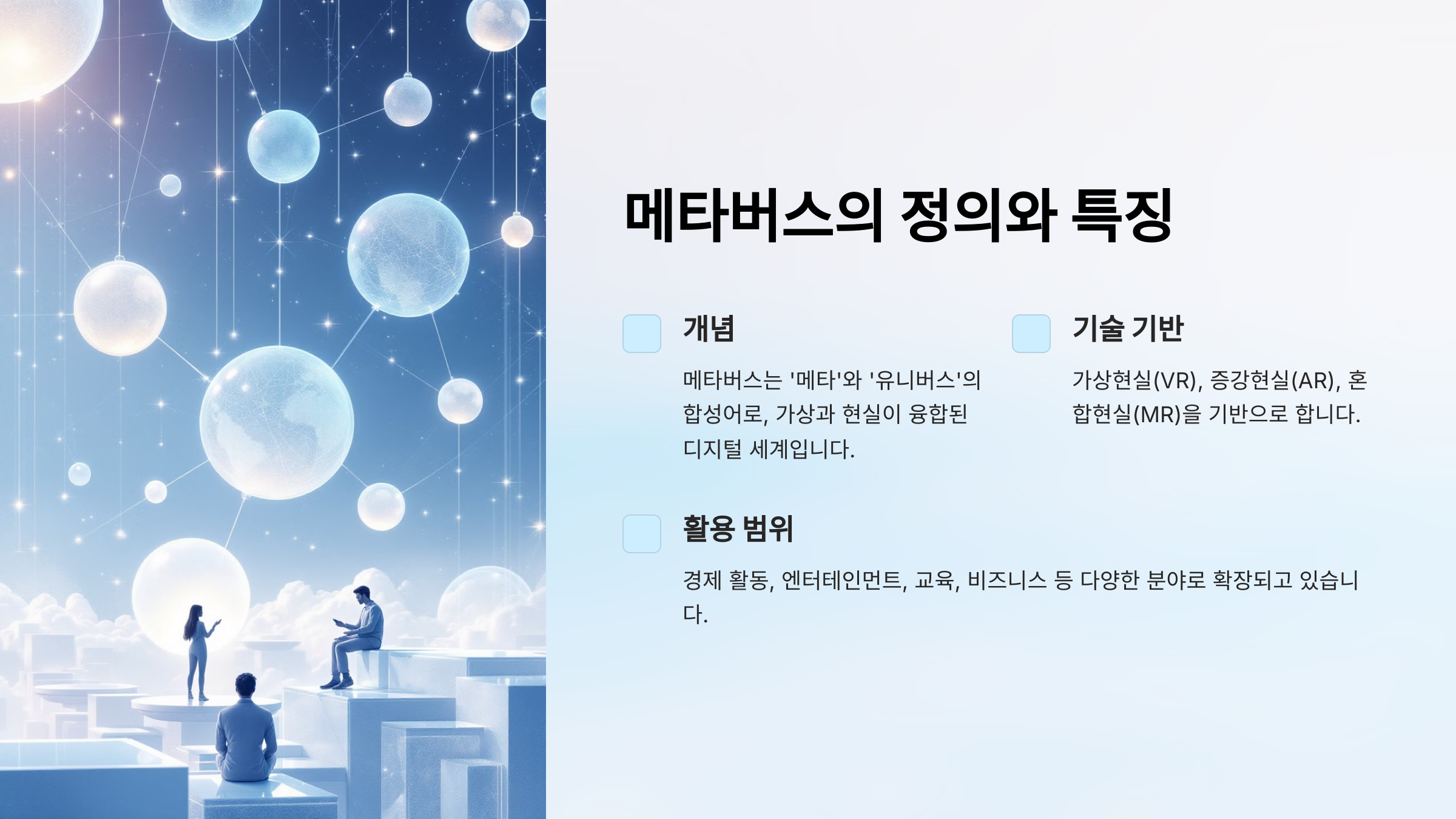 메타버스는 가상현실과 현실이 융합된 디지털 세계로, 다양한 활동이 가능합니다.