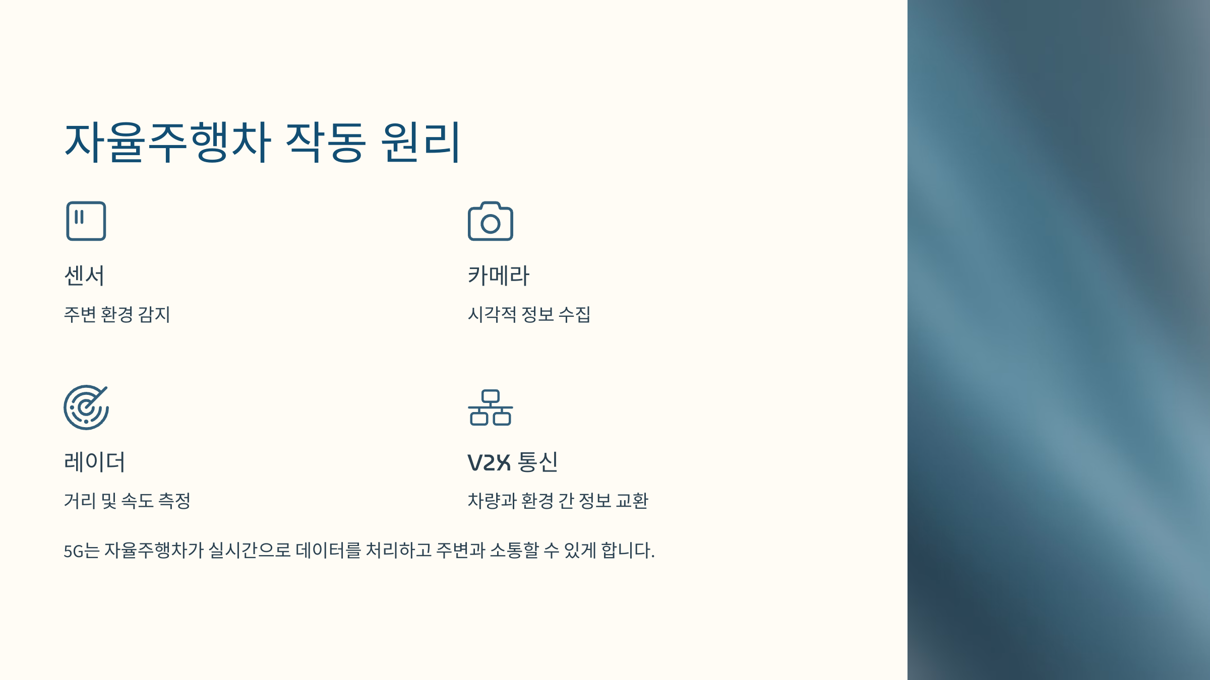 자율주행차는 5G를 통해 실시간 데이터를 처리하여 사고를 예방하고 안전성을 높입니다.