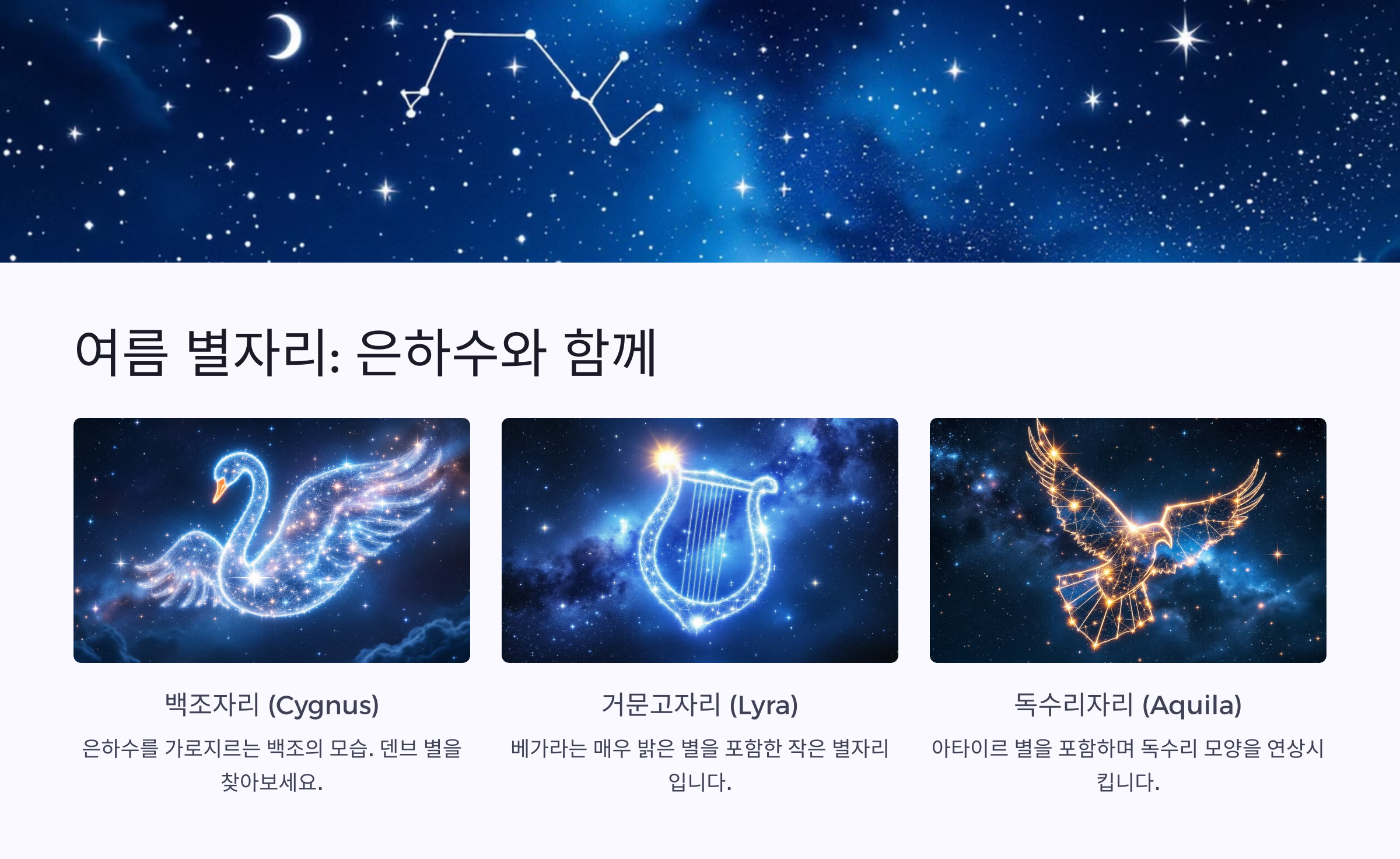 여름 밤하늘은 은하수를 배경으로 한 화려한 별자리들로 가득합니다. 대표적인 여름 별자리는 백조자리(Cygnus), 거문고자리(Lyra), 독수리자리(Aquila)입니다.