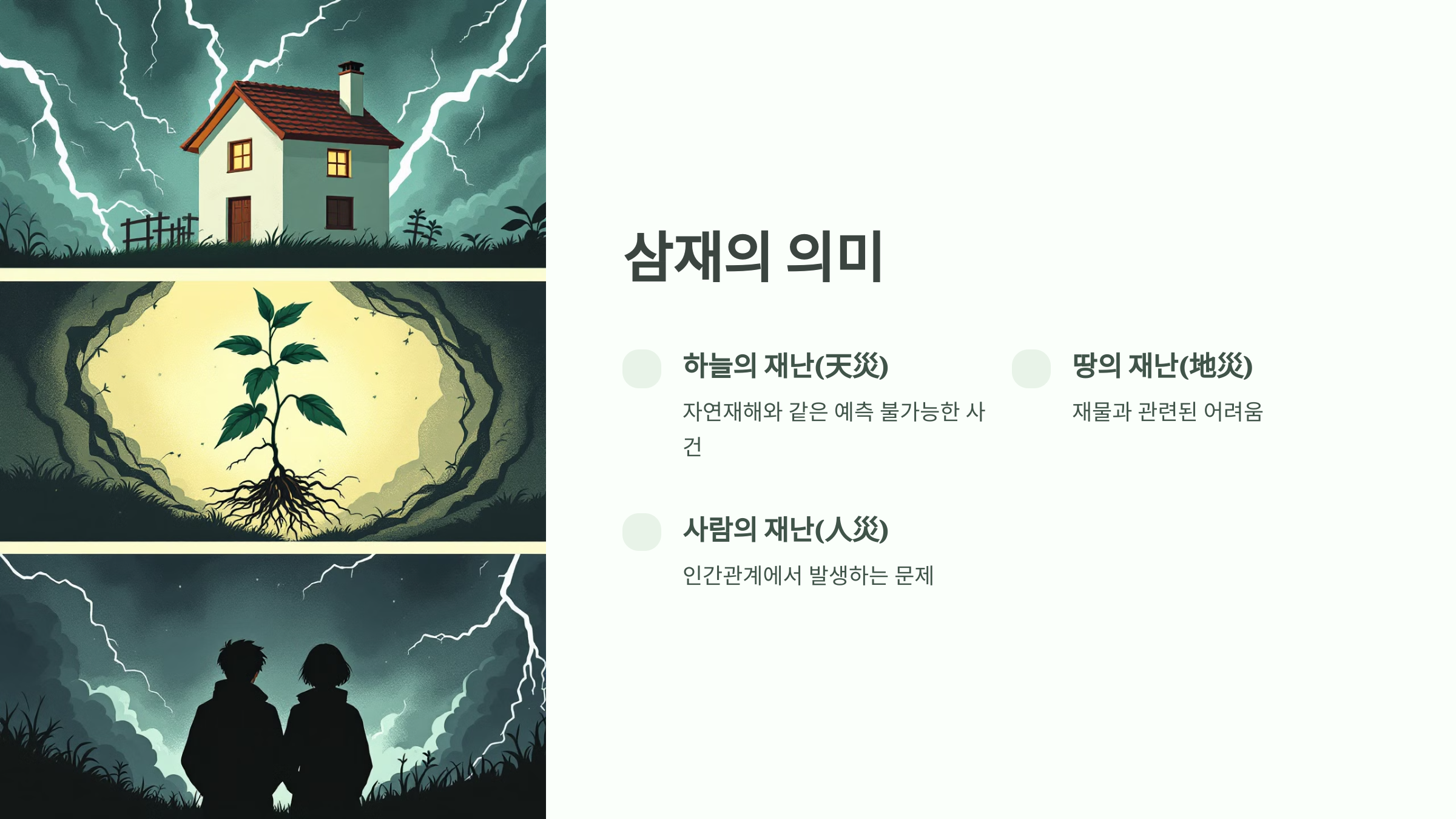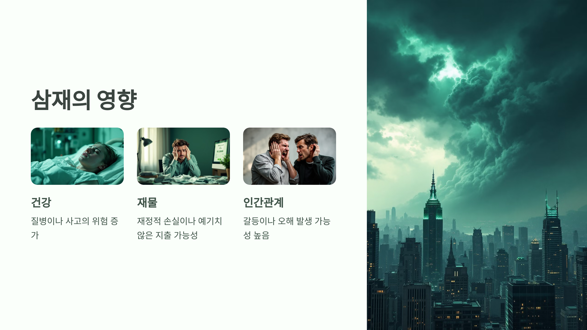 하지만 삼재는 단순히 불운의 시기가 아니라, 자신을 되돌아보고 성장할 수 있는 기회로도 여겨집니다. 이는 올바른 태도와 대비를 통해 극복할 수 있습니다.