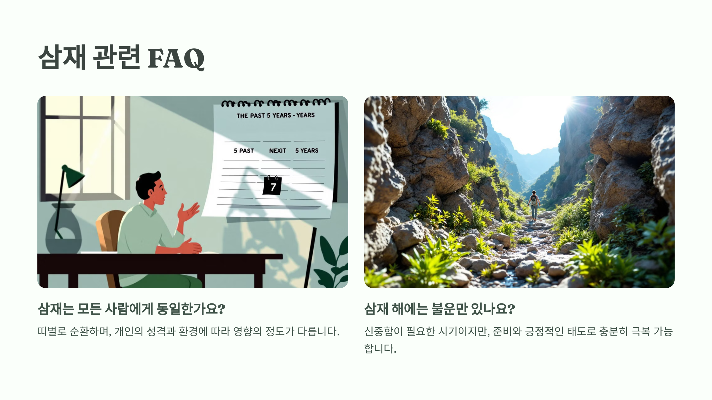 삼재는 순환적이며 피할 수 없는 자연스러운 주기입니다. 이를 인정하고, 자신에게 맞는 대응 전략을 세우는 것이 중요합니다.