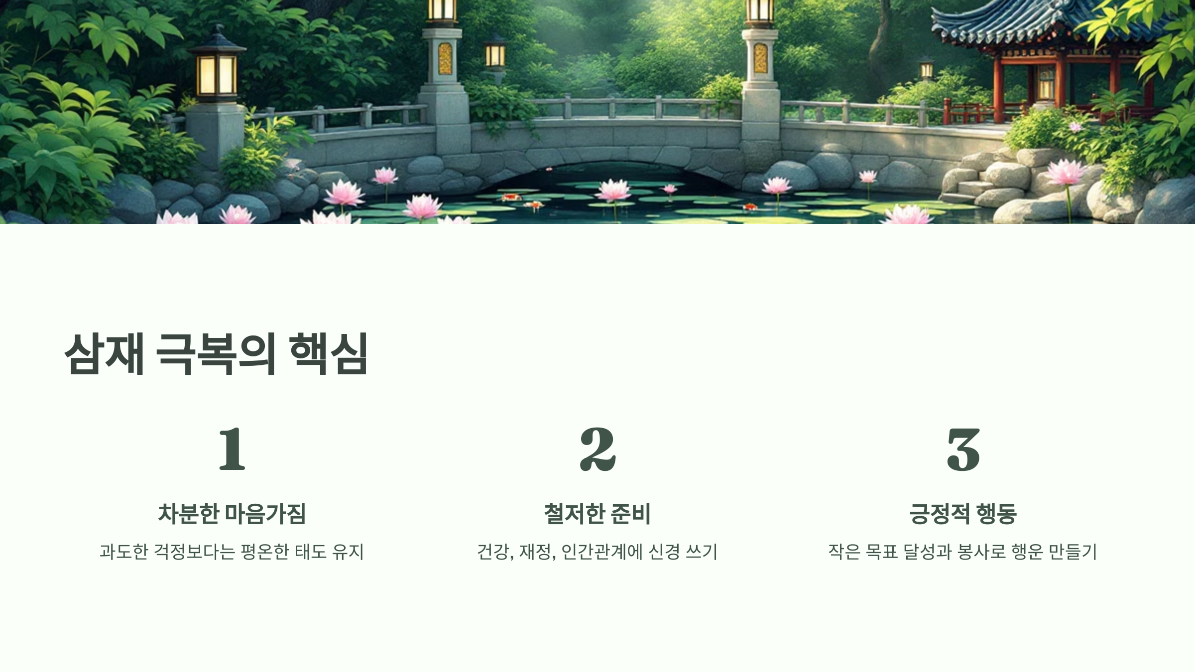 삼재는 자연스러운 주기로 피할 수는 없지만, 예방과 준비를 통해 그 영향을 최소화할 수 있습니다.