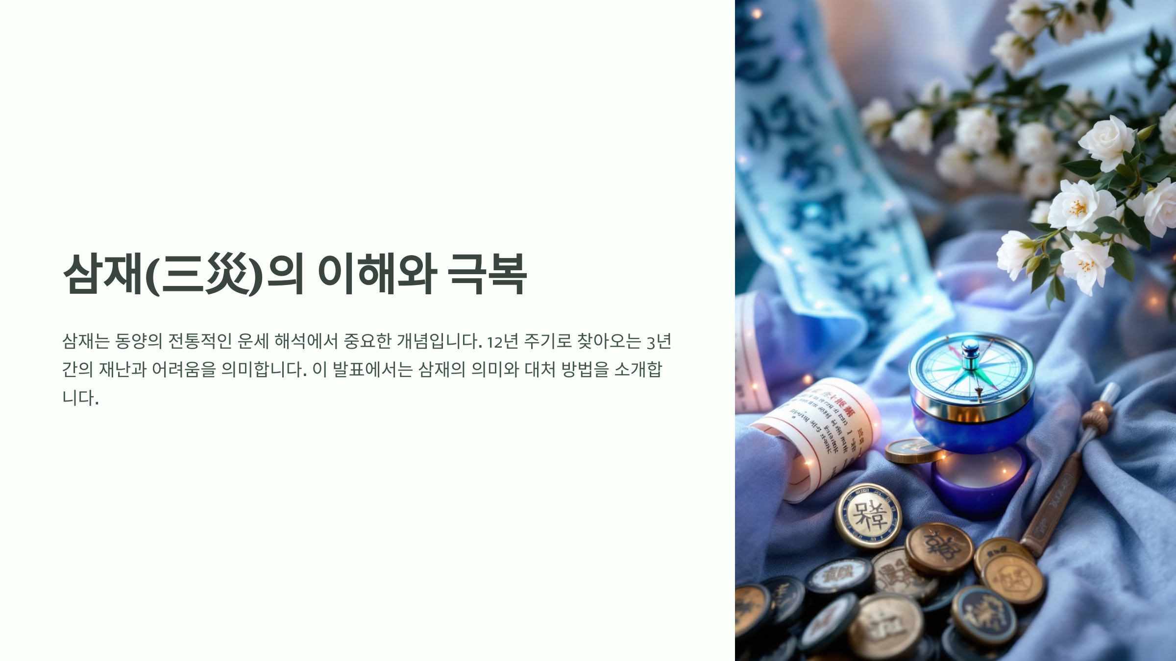 삼재 해는 불운이 아닌 신중함이 필요한 시기로 여겨집니다. 올바른 준비와 태도로 충분히 극복할 수 있습니다.