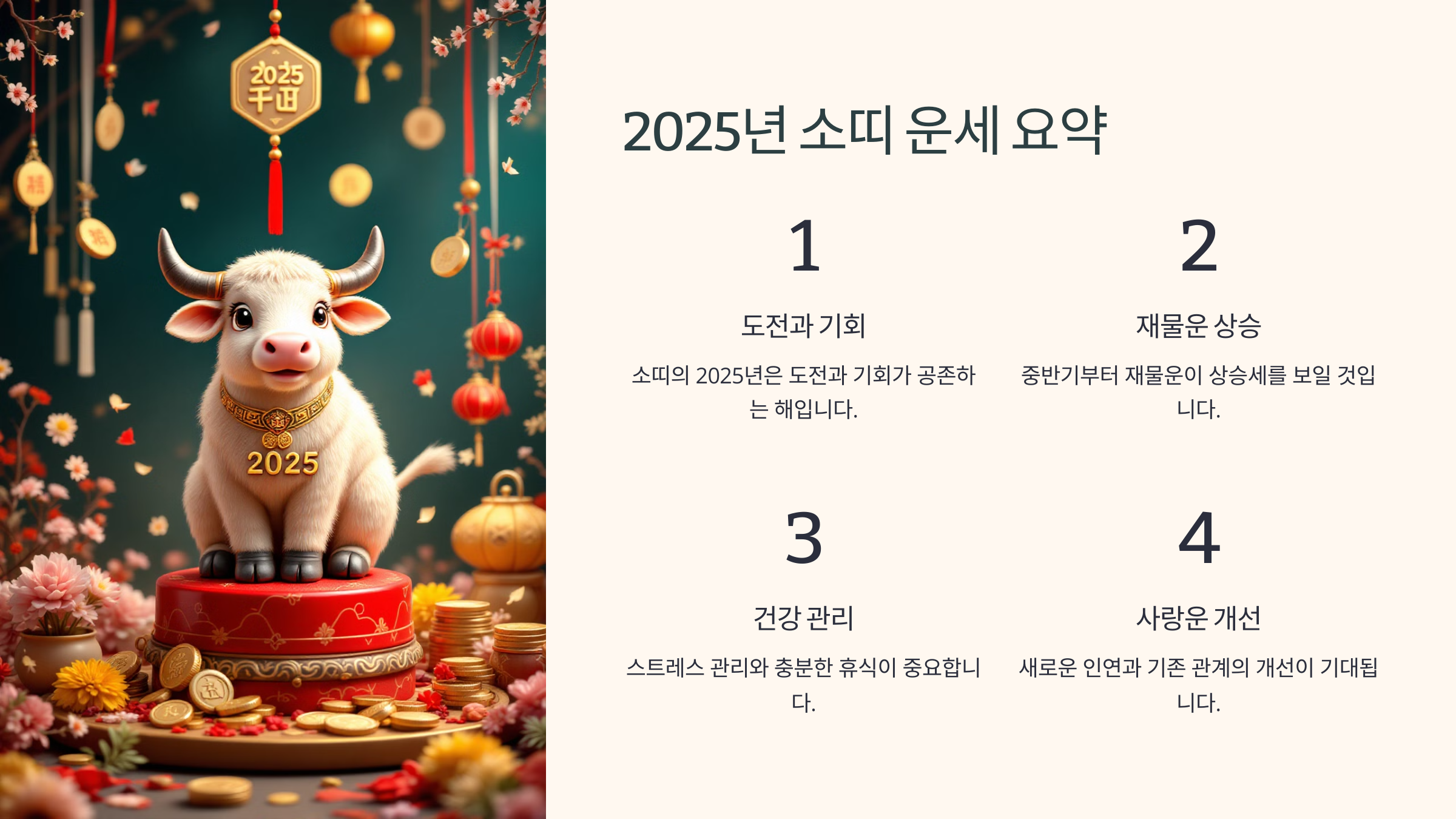 소띠의 2025년은 도전과 기회가 공존하는 해로, 재물, 건강, 사랑운 모두 긍정적인 변화를 기대할 수 있습니다.