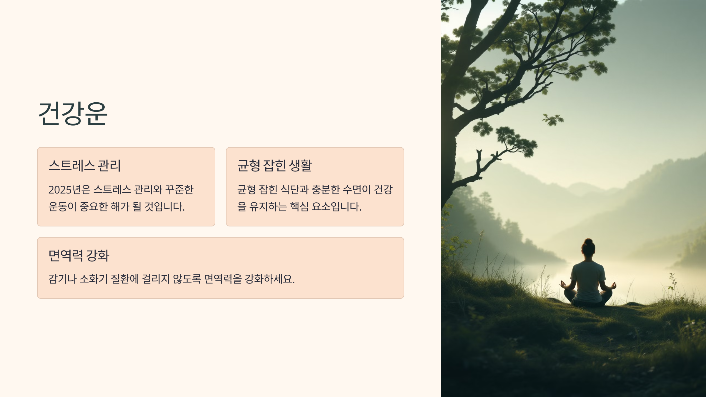 건강운 측면에서 2025년은 스트레스 관리와 꾸준한 운동이 중요한 해가 될 것입니다.