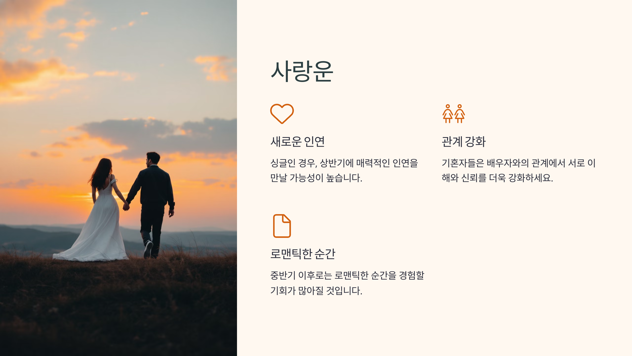 사랑운에서는 새로운 만남이 다가오거나 기존 관계가 더 깊어질 가능성이 큽니다.