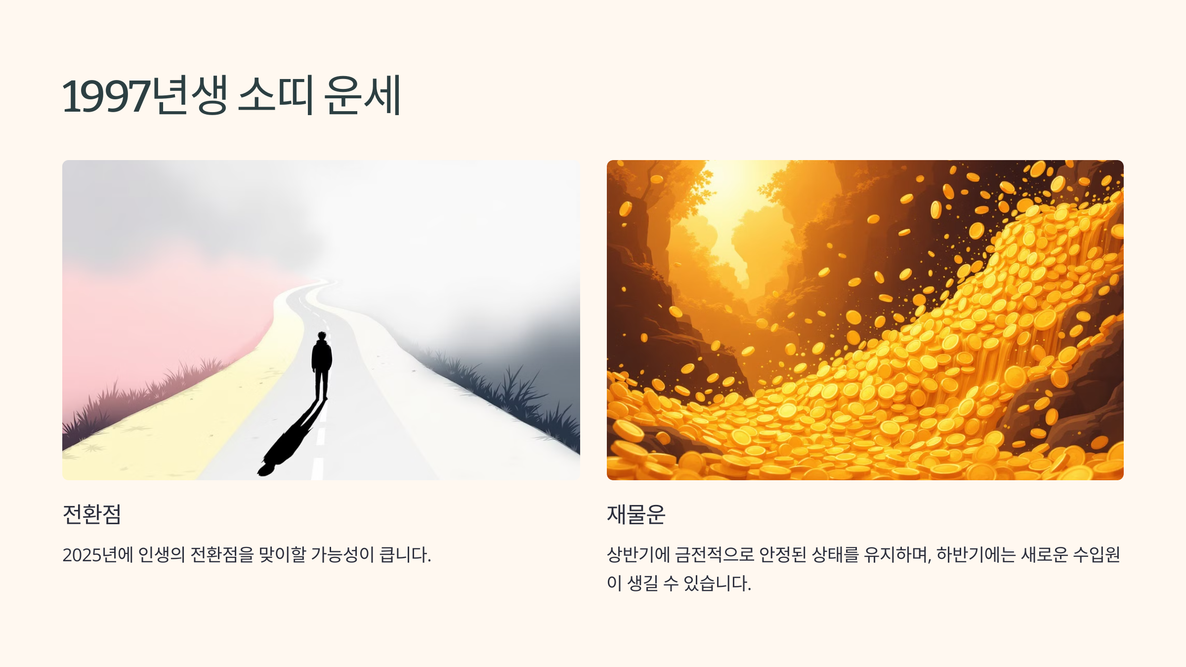 1997년생 소띠는 2025년에 인생의 전환점을 맞이할 가능성이 큽니다.