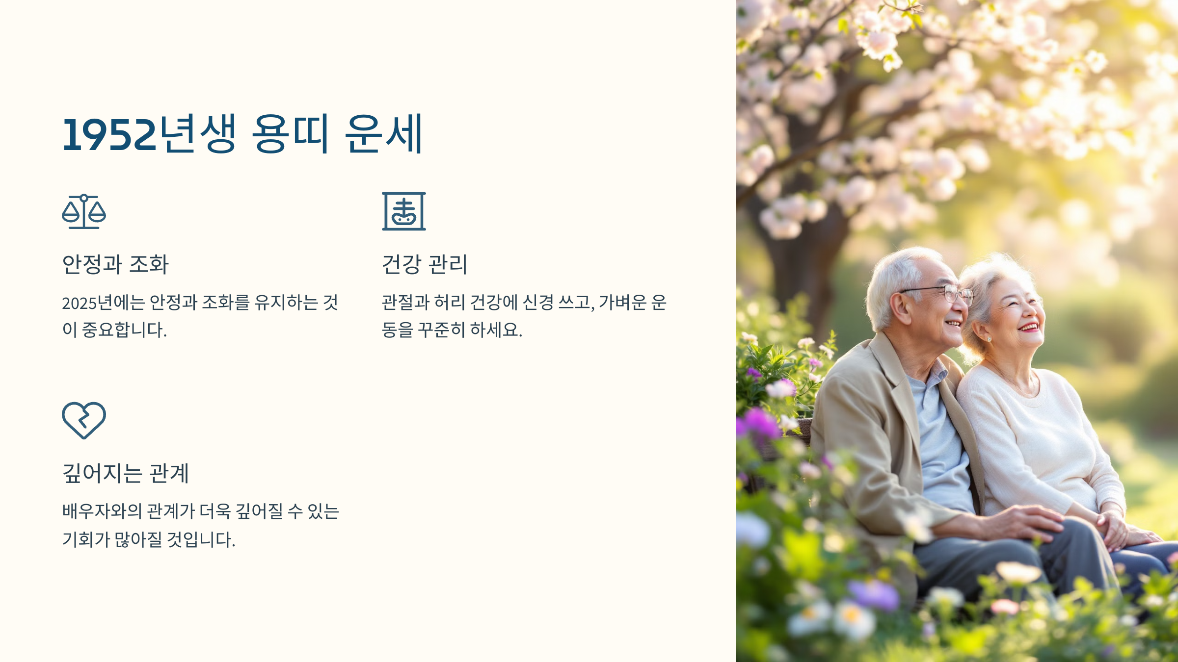 1952년생 용띠에게 2025년은 안정과 균형이 중요한 해로, 재산 관리와 건강 유지에 중점을 둬야 합니다.