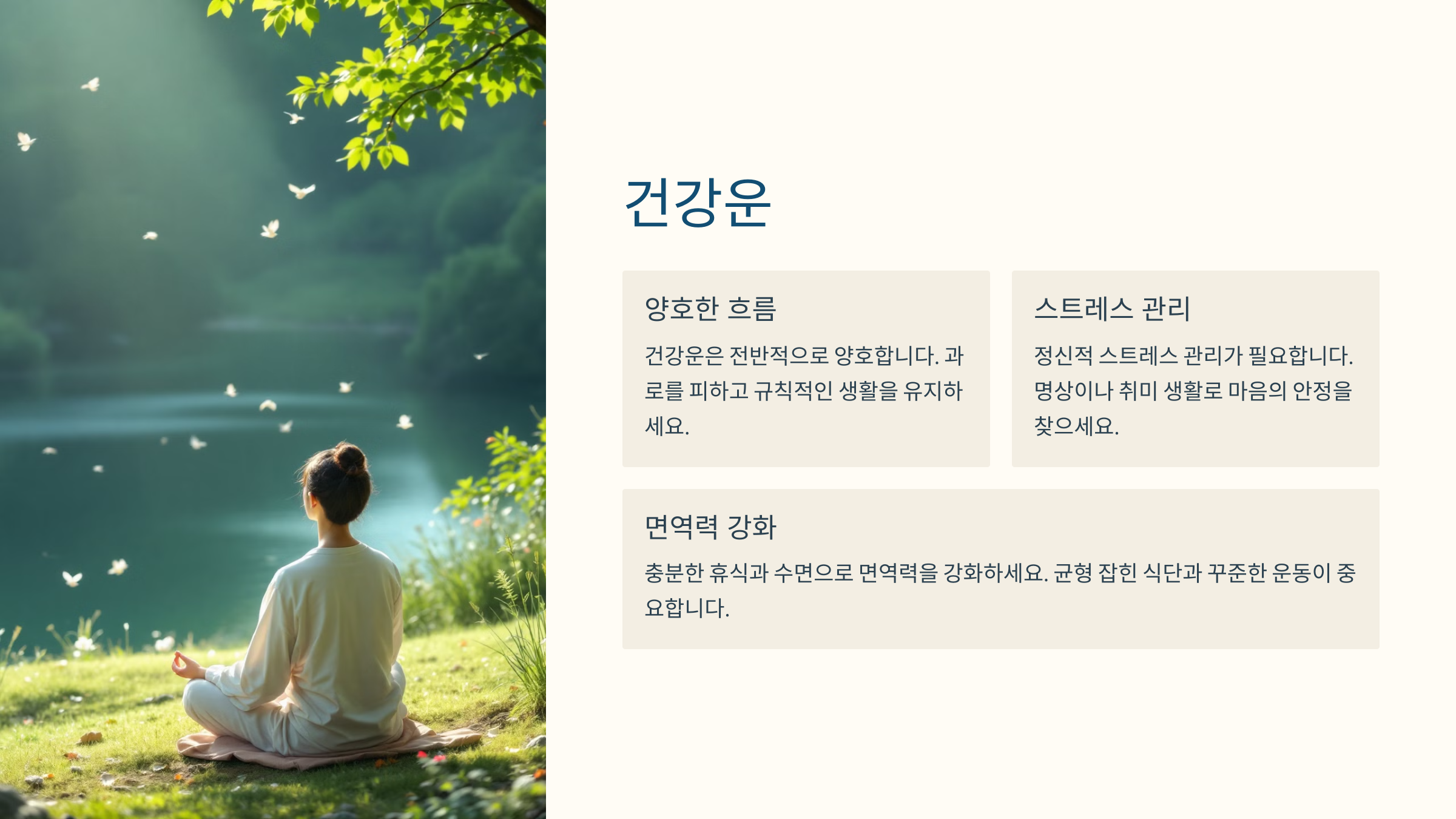 건강운은 전반적으로 양호하며, 규칙적인 수면과 식습관이 중요합니다.