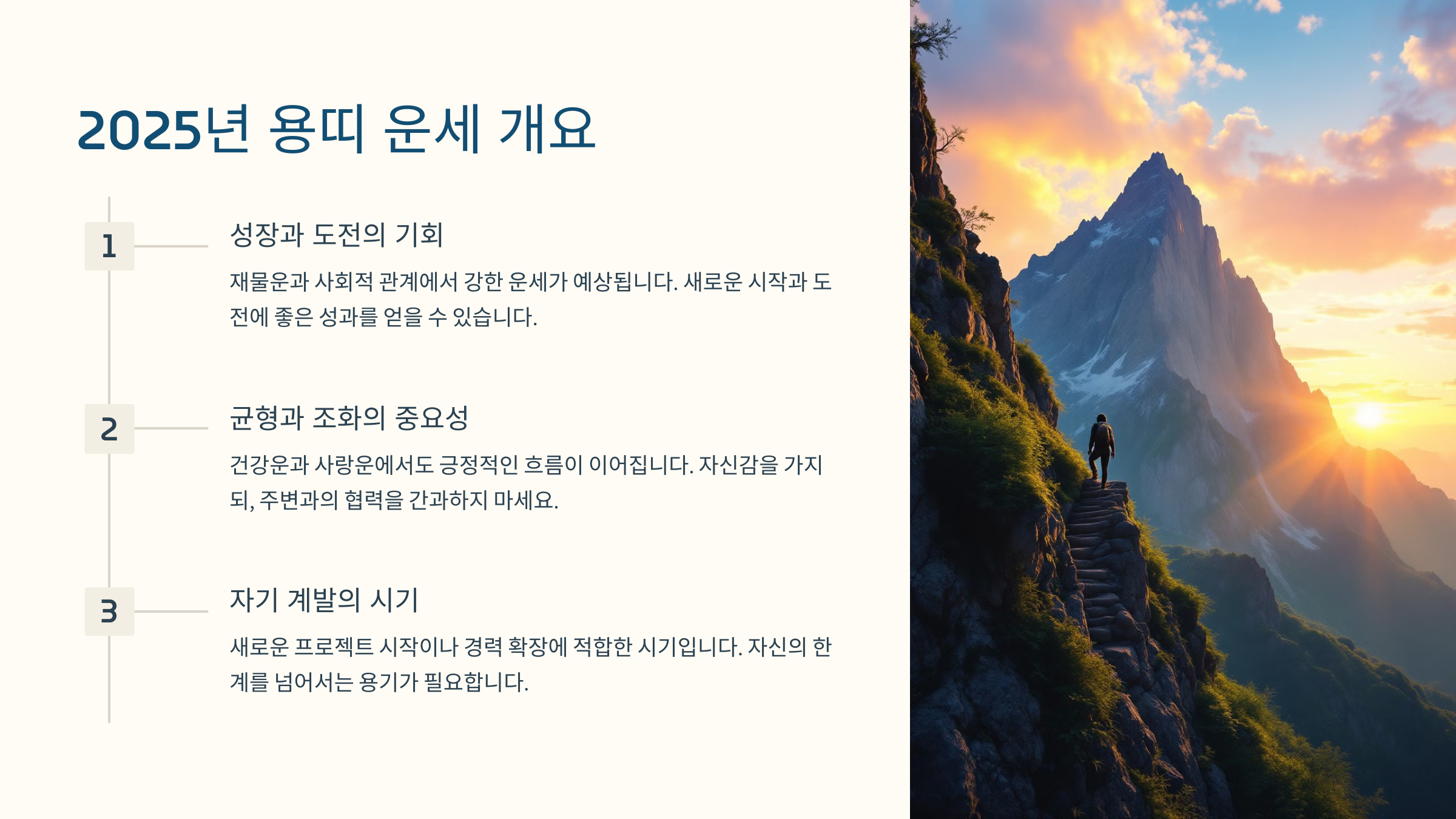 2025년은 용띠에게 도전과 성장이 공존하는 해로, 재물운과 사회적 관계에서 강한 상승세를 보이며 전반적으로 긍정적인 흐름을 기대할 수 있습니다.