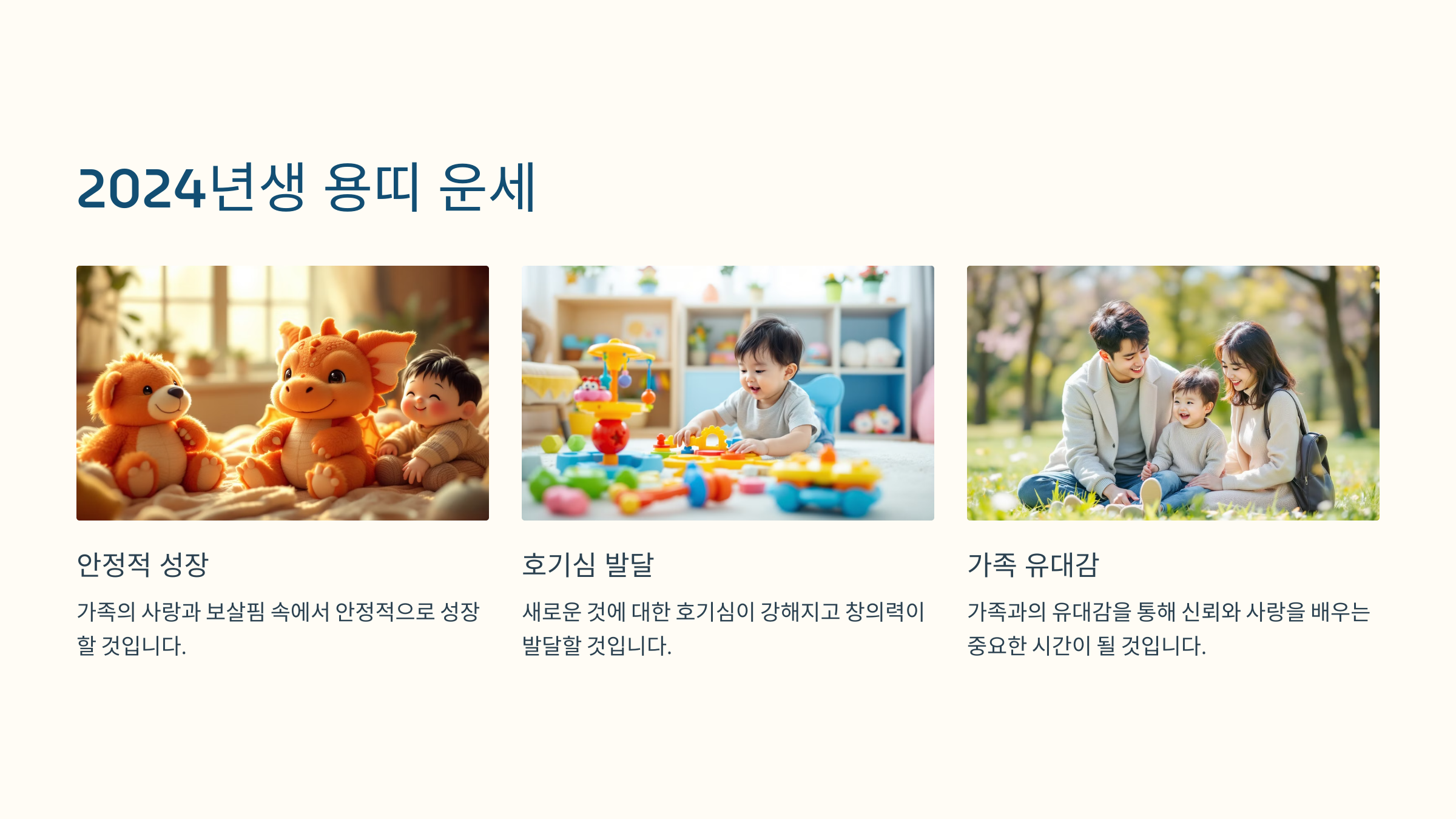 2024년생 용띠는 가족의 사랑과 보살핌 속에서 안정적으로 성장하며, 새로운 것에 대한 호기심과 창의력이 두드러질 것입니다.