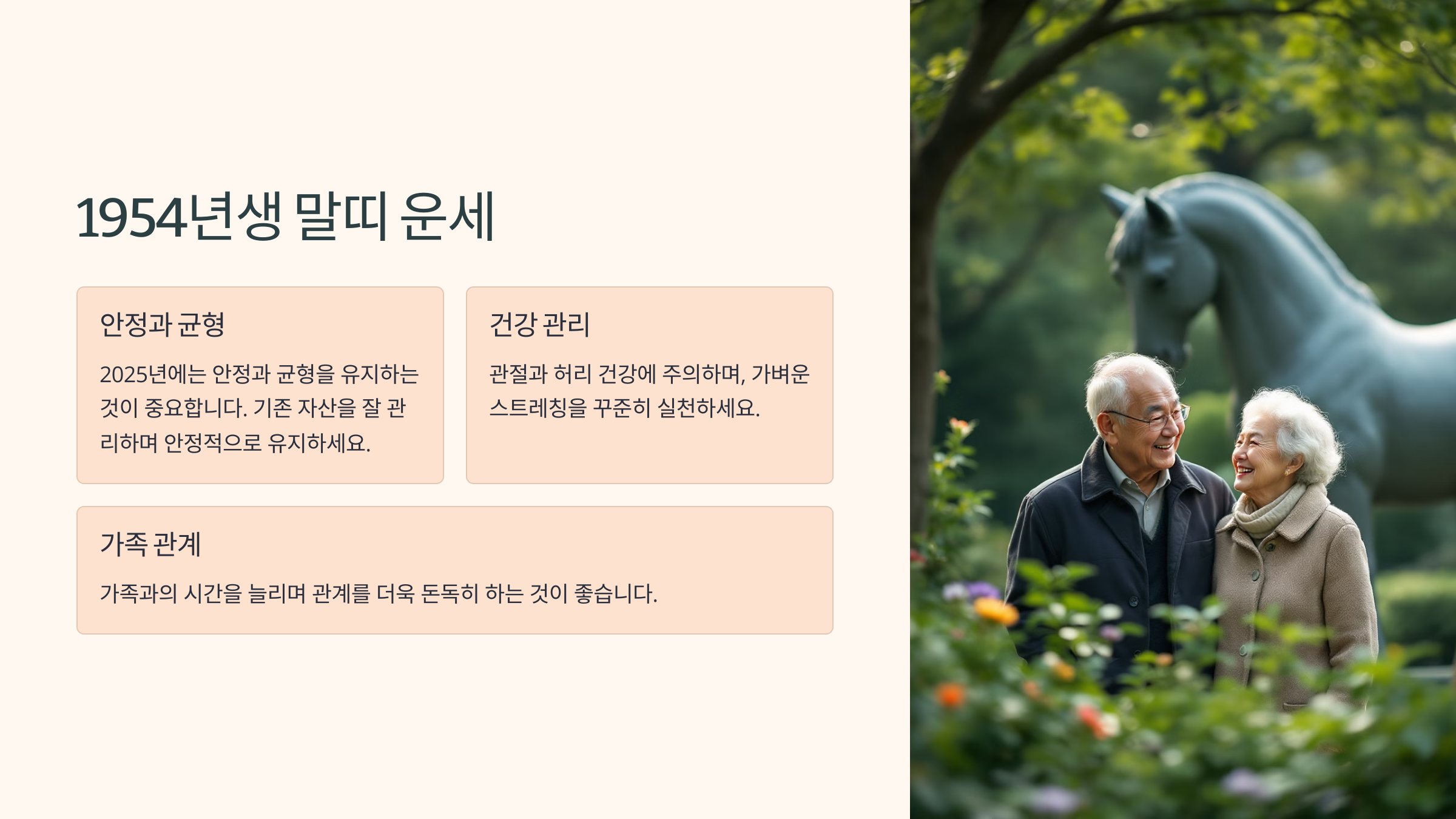 1954년생 말띠는 2025년에 안정과 균형을 유지하는 것이 중요한 한 해가 될 것입니다.