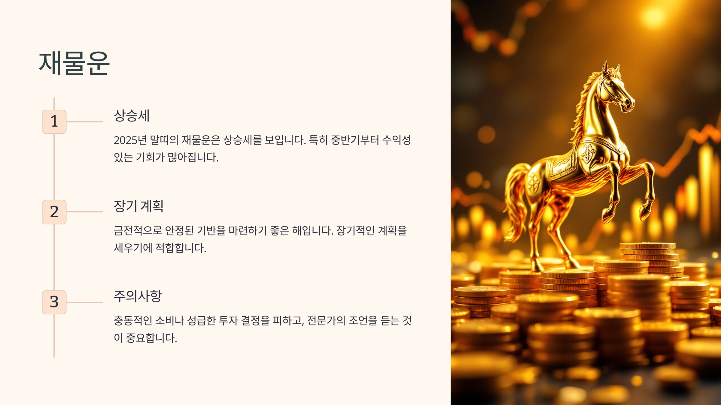 2025년 말띠의 재물운은 상승세를 보이며, 특히 중반기부터 수익성을 기대할 수 있는 기회가 많아집니다.