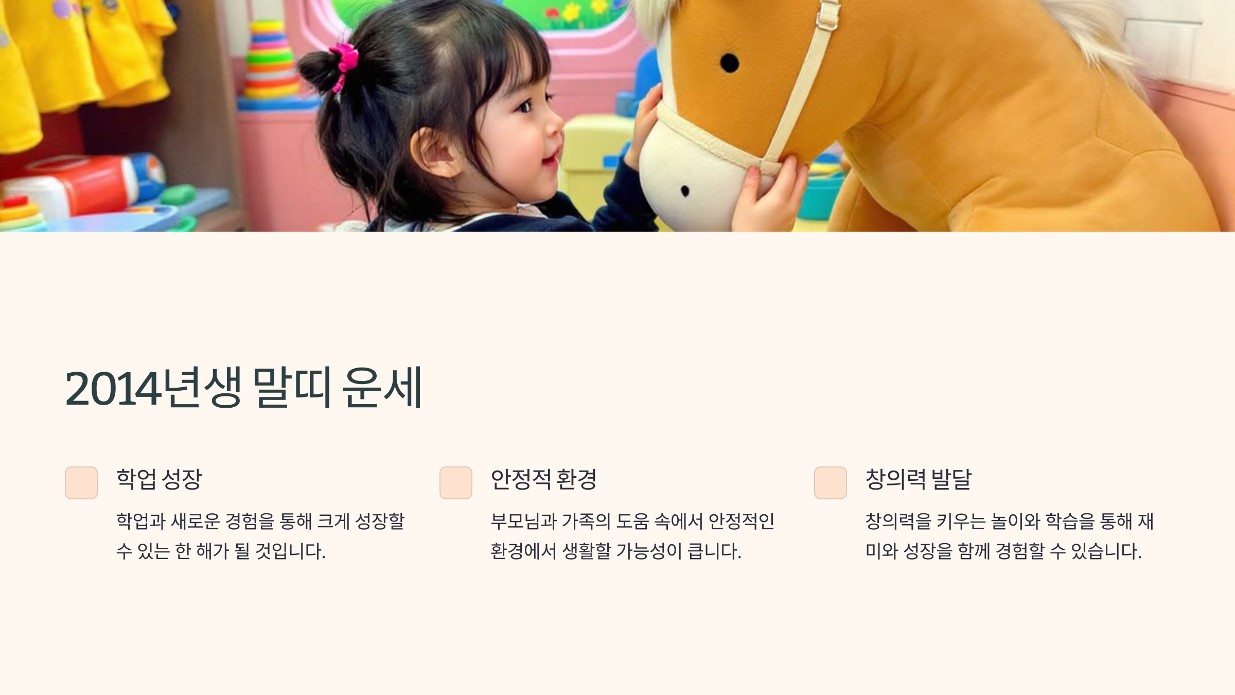 2014년생 말띠는 학업과 창의적인 활동에서 성취를 느끼며, 자신감을 쌓는 한 해가 될 것입니다.