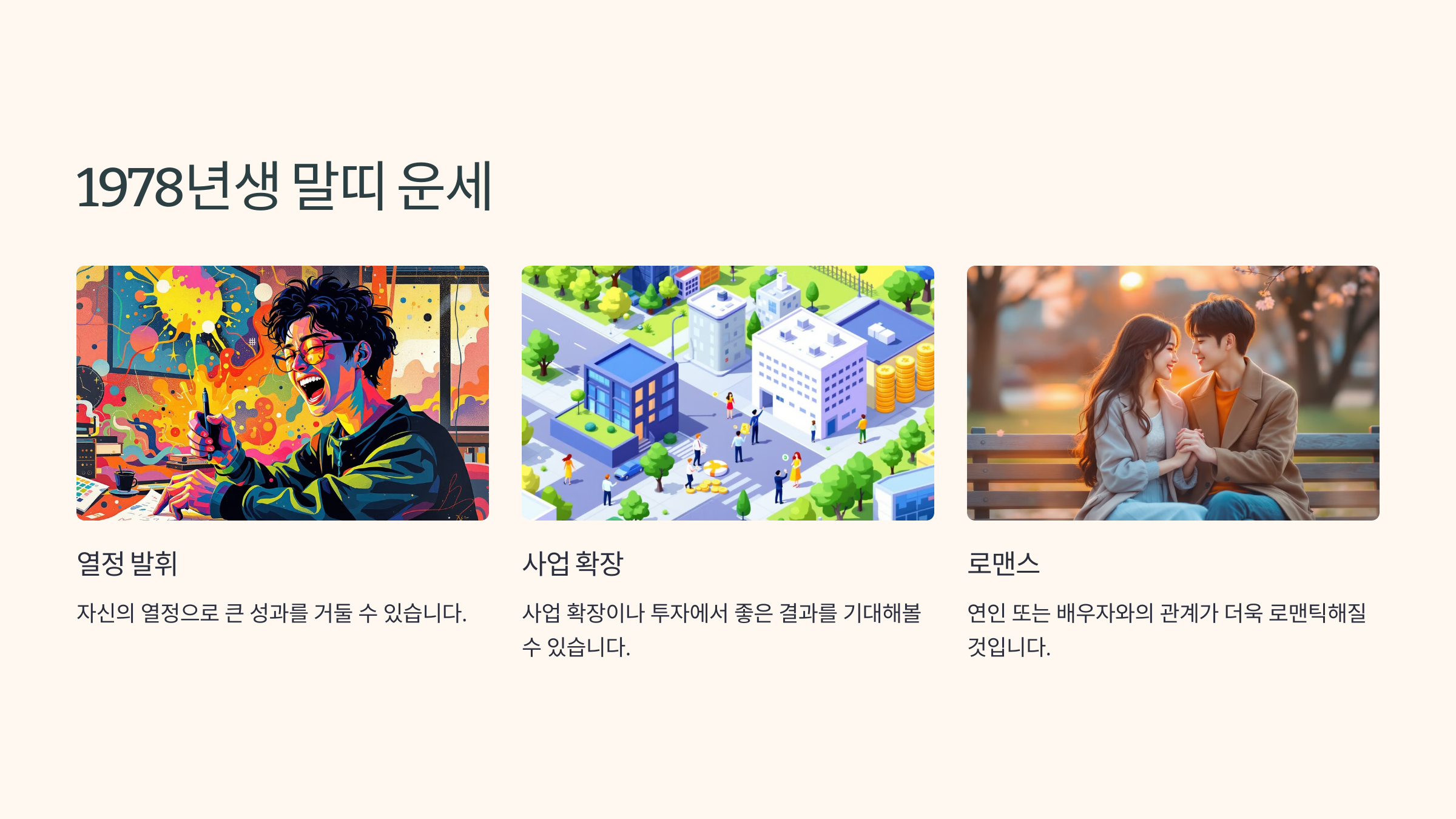 재물운, 건강운, 사랑운 모두 전반적으로 긍정적인 흐름을 보이며, 큰 성취를 이룰 가능성이 높습니다.