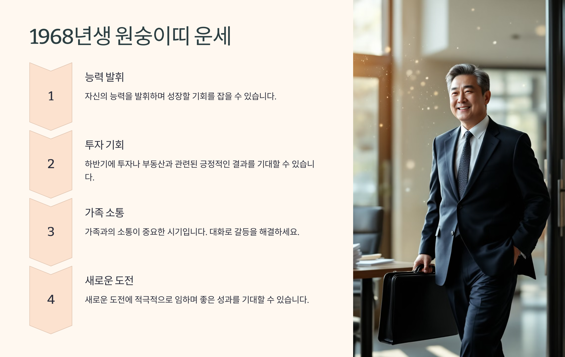 1968년생 원숭이띠는 직장과 대인관계에서 성과를 기대할 수 있는 해로, 꾸준한 노력과 적극적인 자세가 필요합니다.