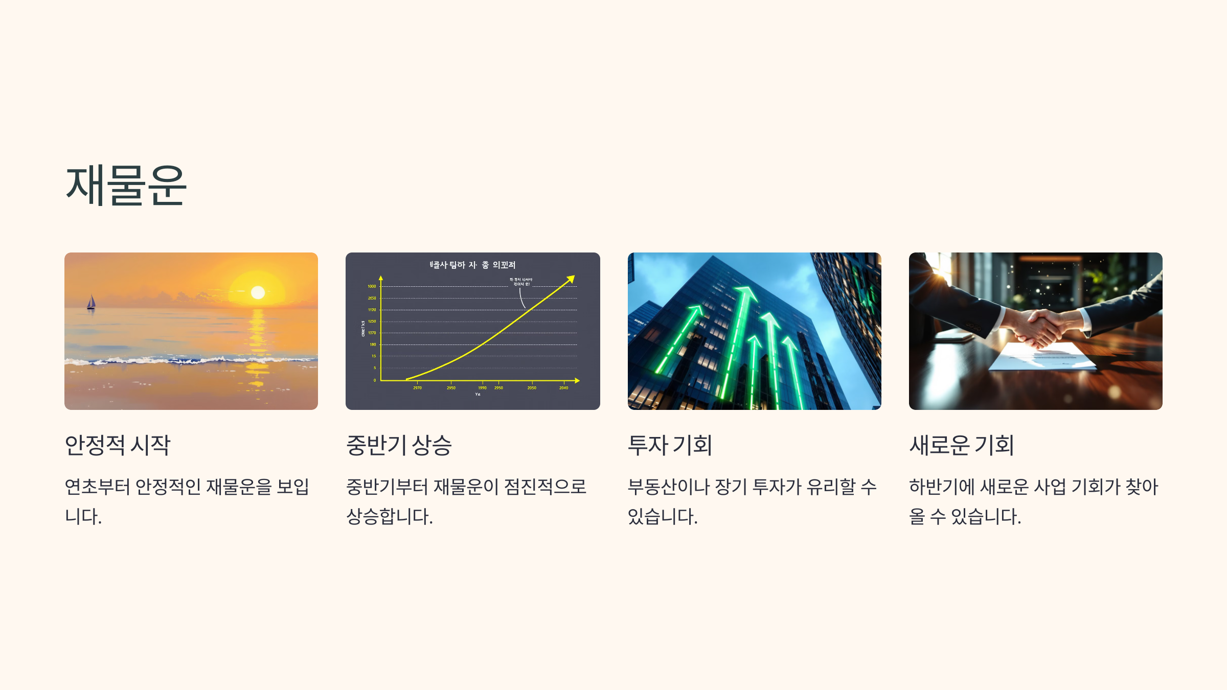 재물운은 중반기부터 점진적으로 상승하며, 특히 장기적인 투자나 새로운 사업에서 긍정적인 결과를 얻을 가능성이 높습니다.