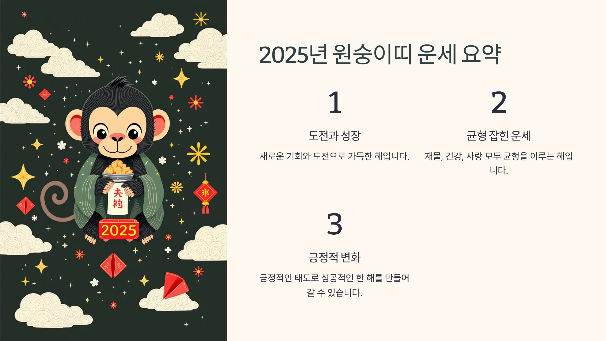 2025년은 원숭이띠에게 새로운 도전과 성장이 어우러지는 해로, 재물운, 건강운, 사랑운 모두 긍정적인 변화를 기대할 수 있습니다.