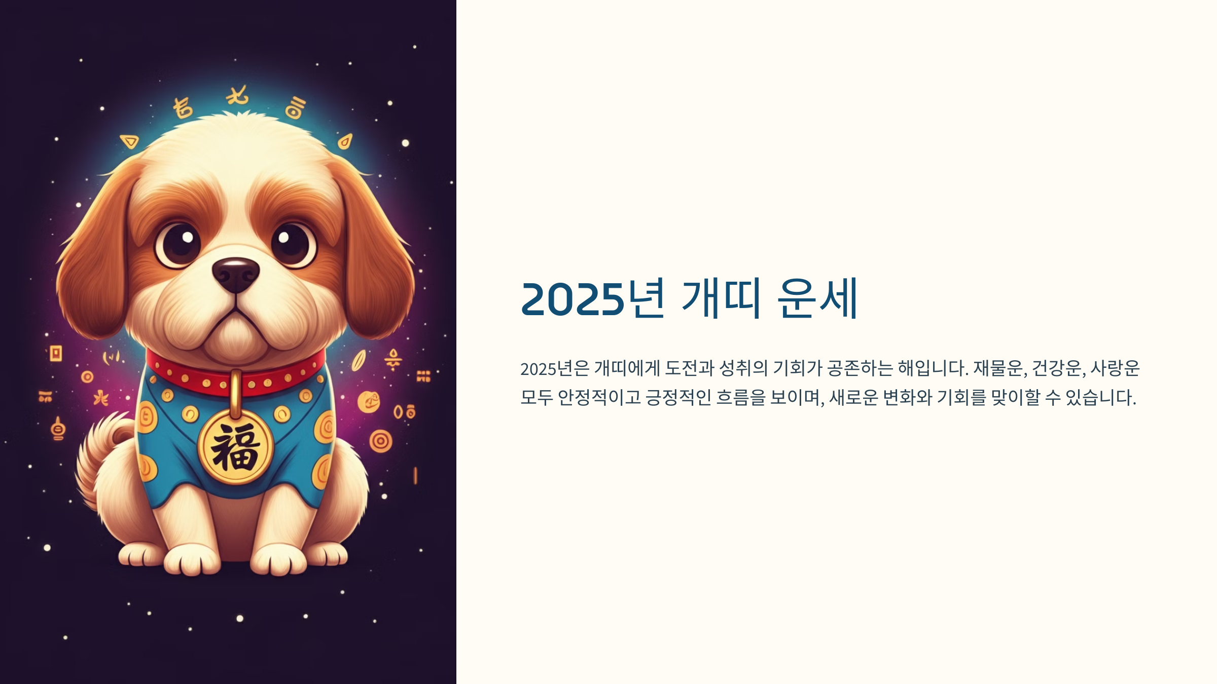 2025년은 개띠에게 도전과 성취의 기회가 많은 해로, 재물운, 건강운, 사랑운 모두 안정적인 흐름을 기대할 수 있습니다.