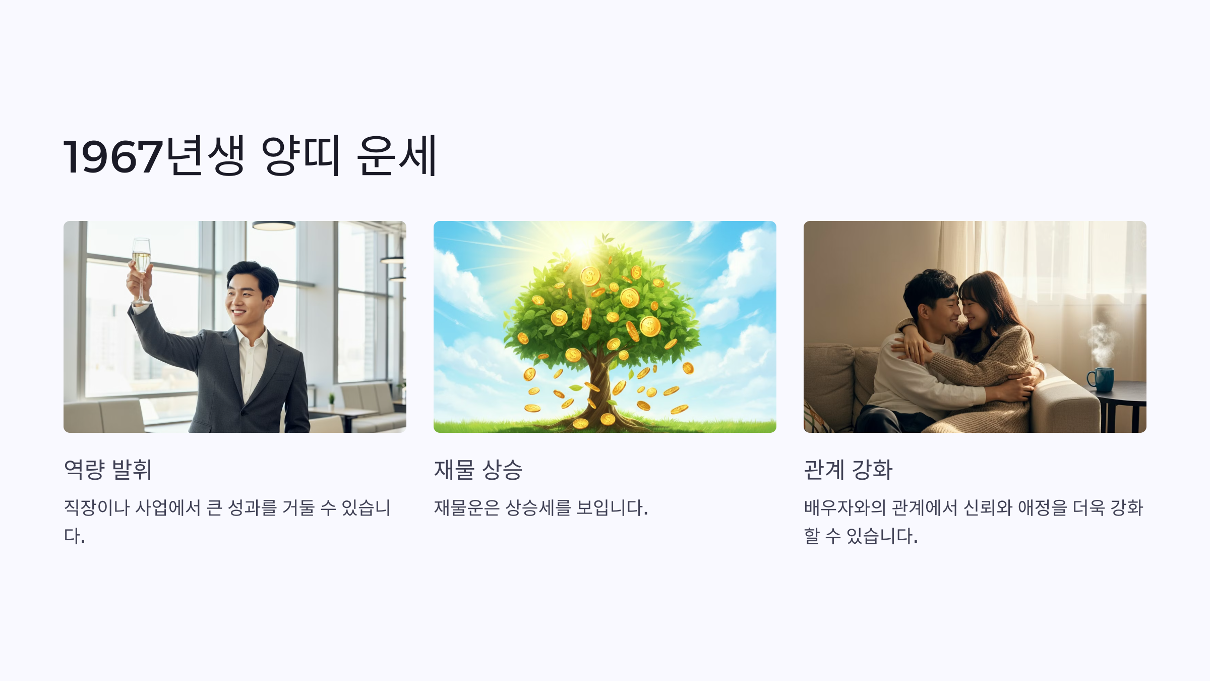 1967년생 양띠는 2025년에 자신의 역량을 발휘하며 직장이나 사업에서 큰 성과를 거둘 수 있는 해가 될 것입니다.