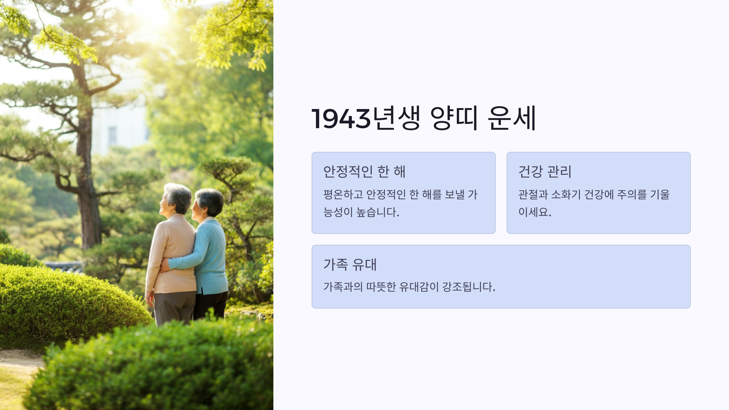 1943년생 양띠는 가족과의 관계에서 정서적 만족감을 느낄 수 있는 해로, 건강 관리와 자산 관리가 중요합니다.
