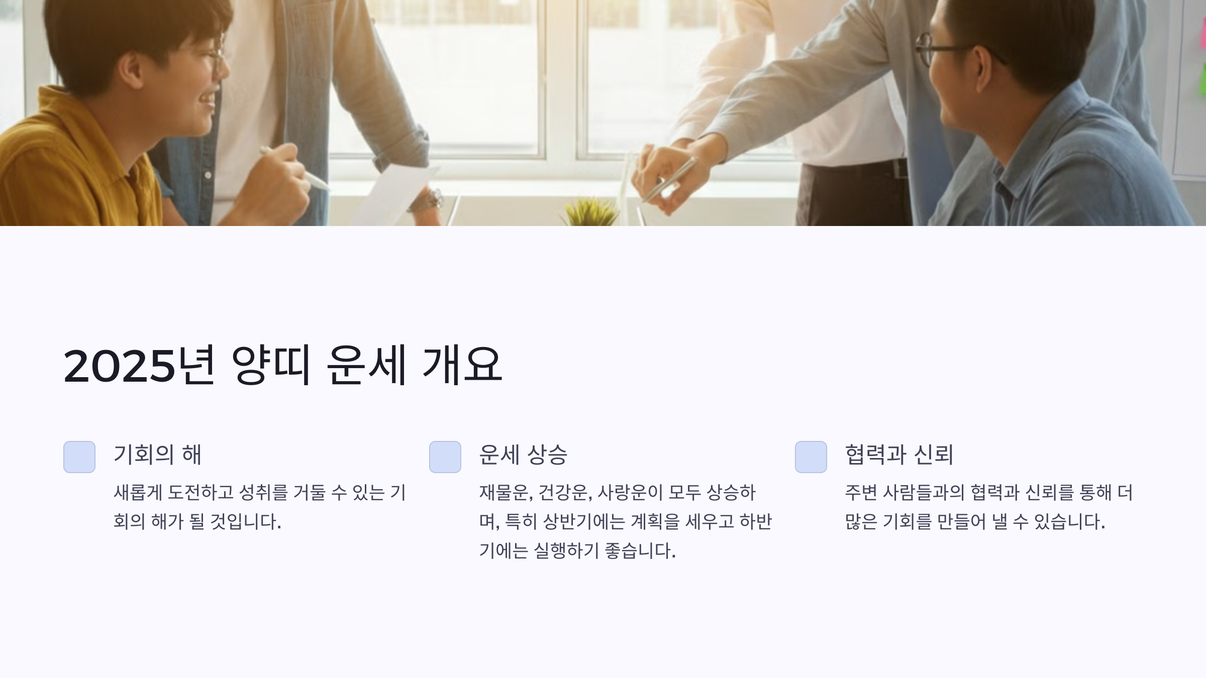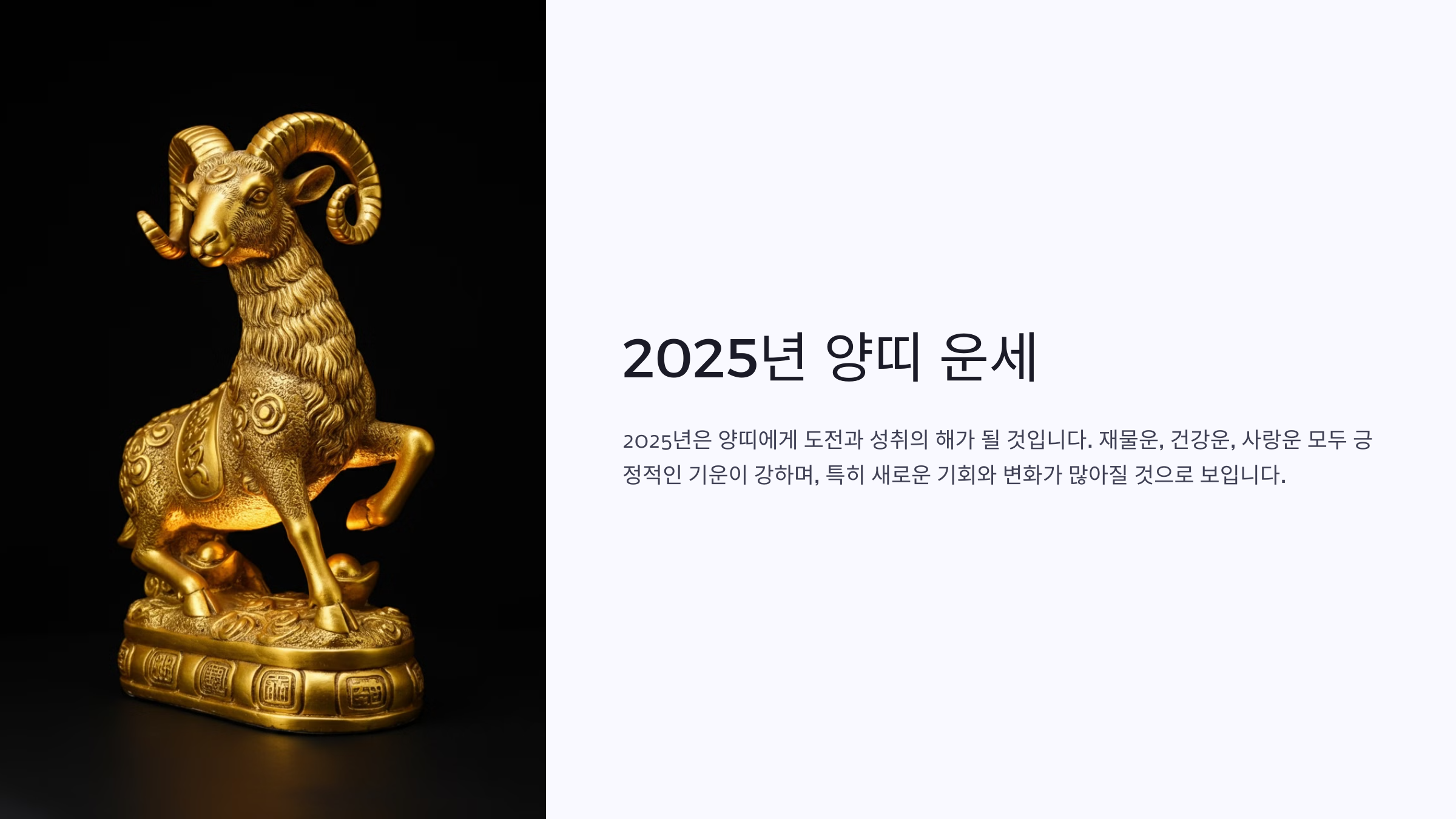 2025년은 양띠에게 도전과 성취의 해로, 재물운, 건강운, 사랑운 모두 긍정적인 흐름을 보이며 새로운 기회가 많아질 것입니다.