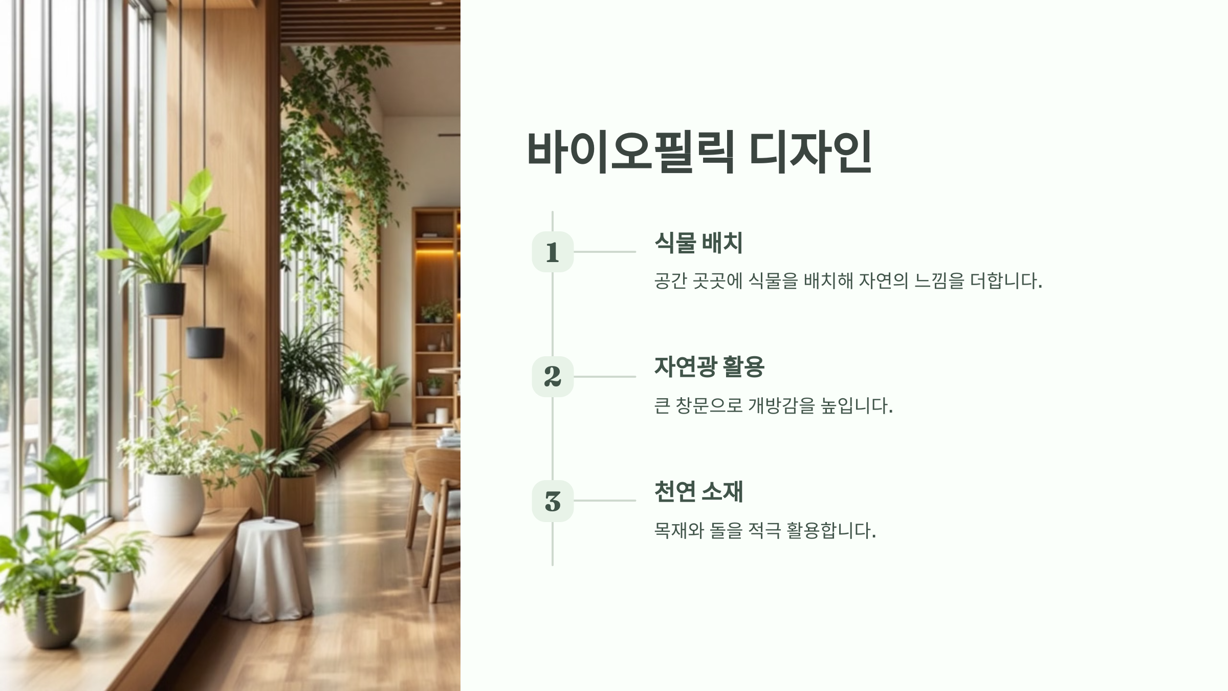바이오필릭 디자인은 자연과 조화를 이루는 인테리어를 의미합니다.