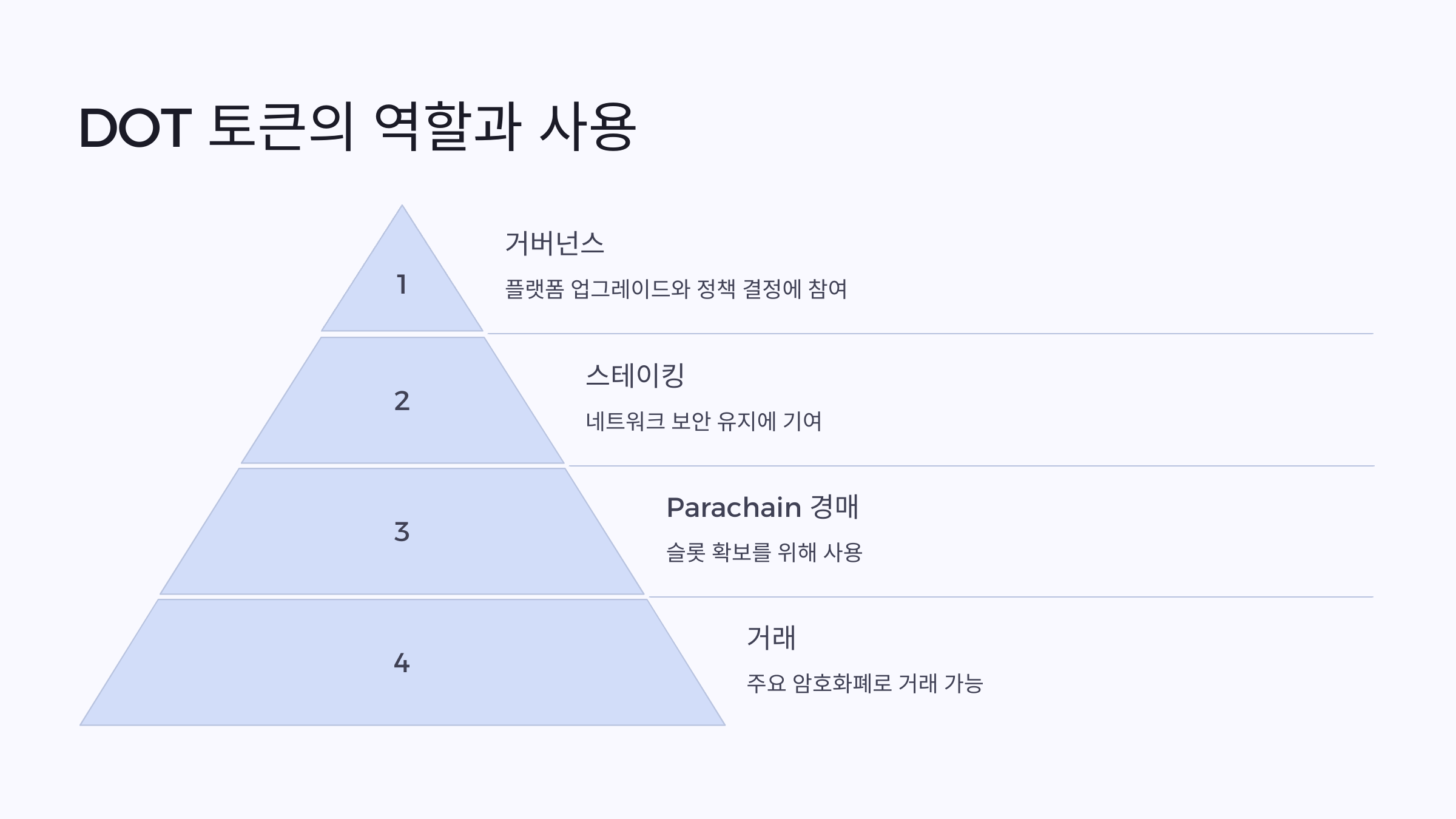 DOT는 거버넌스 참여, 스테이킹, Parachain 경매 등에 사용됩니다.