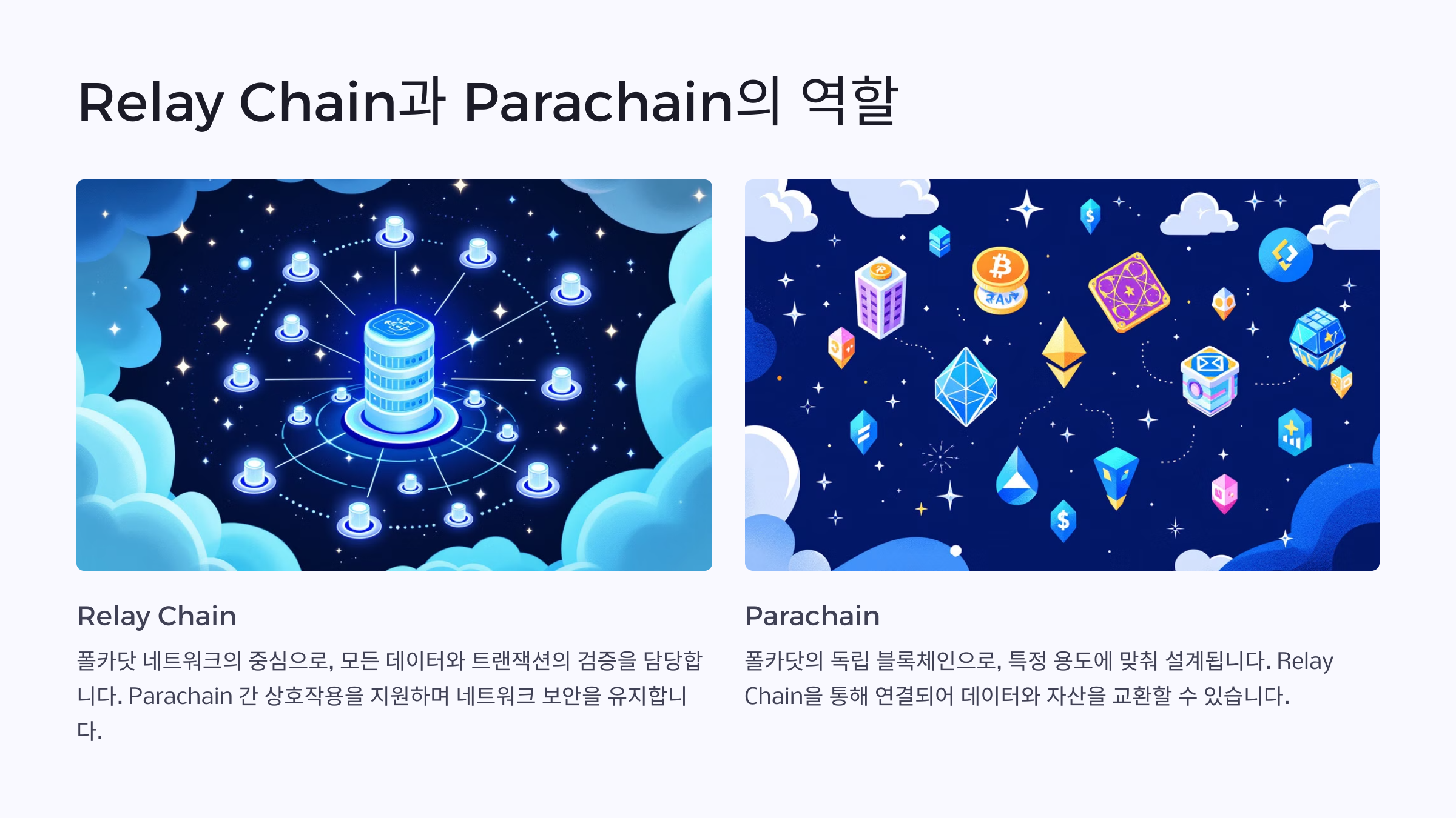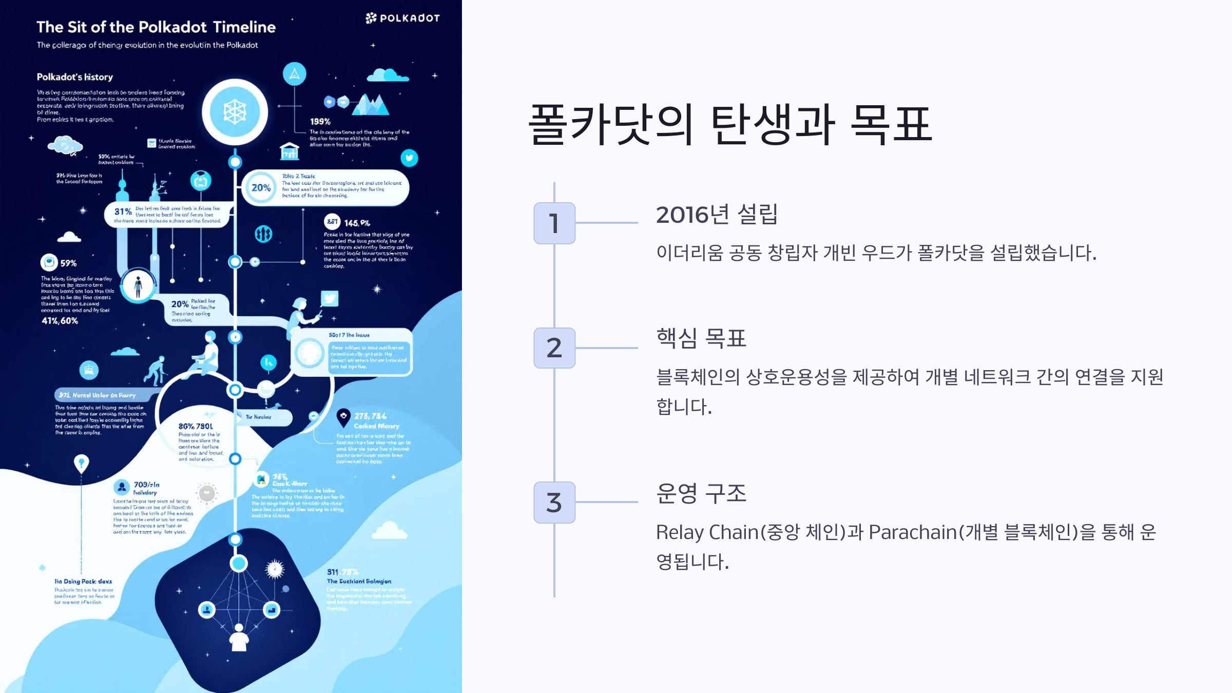 이 네트워크는 Relay Chain(중앙 체인)과 Parachain(개별 블록체인)을 통해 운영됩니다.