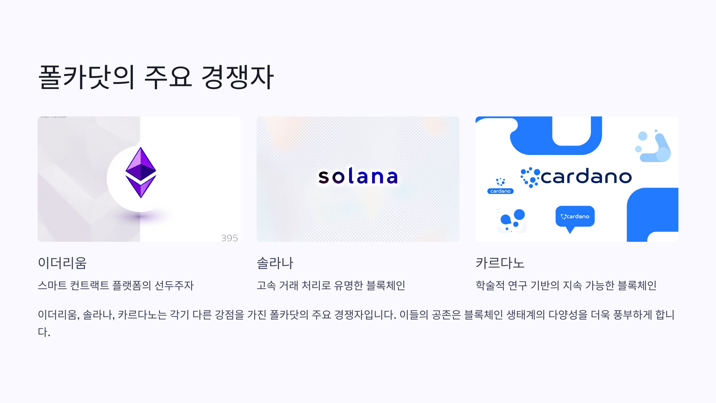 이더리움, 솔라나, 카르다노 등이 폴카닷의 주요 경쟁자로 꼽힙니다.