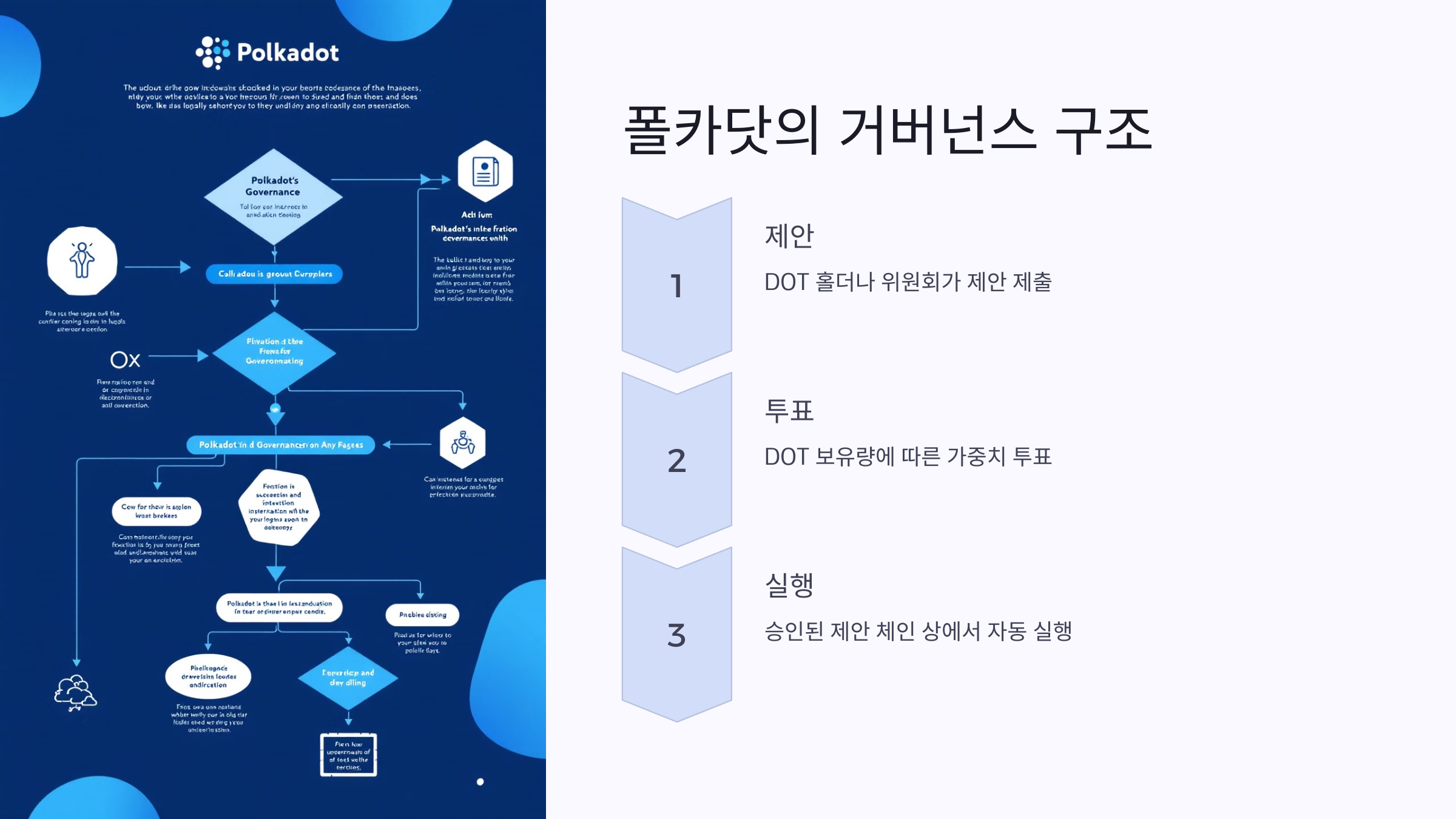 폴카닷의 거버넌스는 제안, 투표, 실행의 세 단계로 구성됩니다.