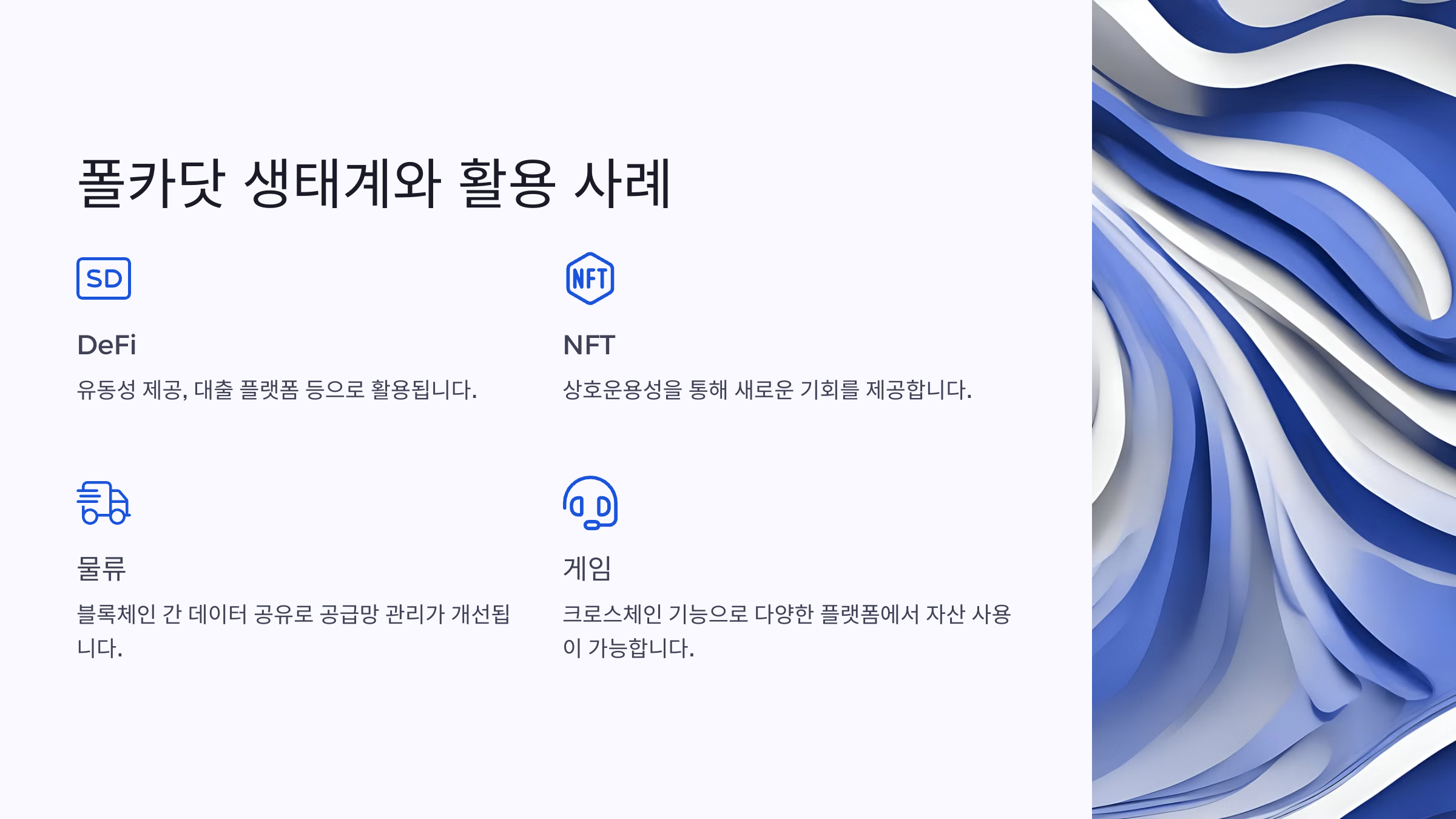 폴카닷은 DeFi, 게임, 물류 등 다양한 산업에서의 활용 가능성을 열어줍니다.